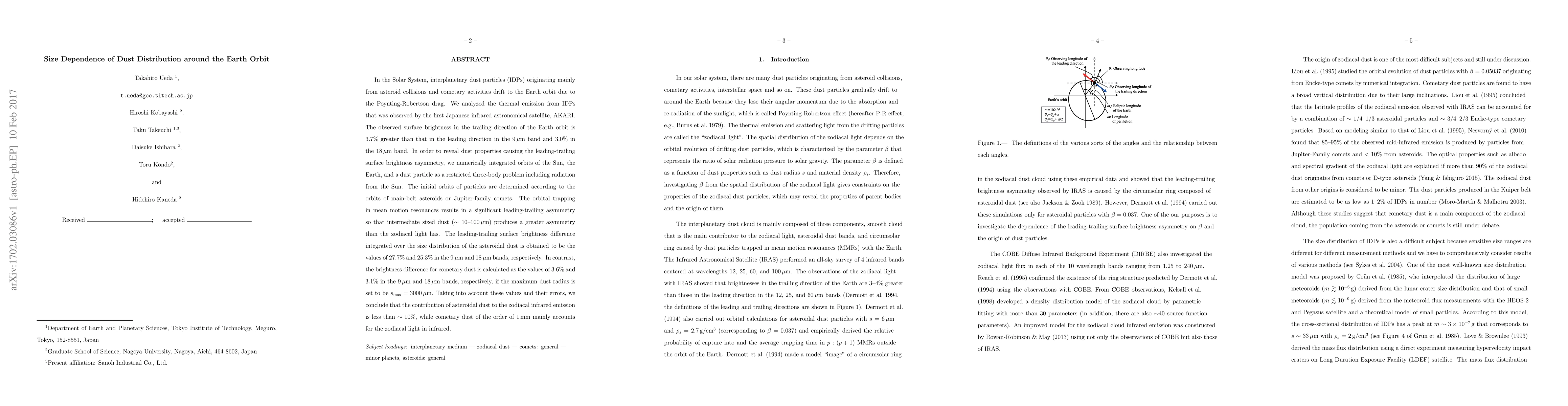 In the Solar System, interplanetary dust particles (IDPs) originating mainly from asteroid collisions and cometary activities drift to the Earth orbit due to the Poynting-Robertson drag. We analyzed the thermal emission from IDPs that was observed by the first Japanese infrared astronomical satellite, AKARI. The observed surface brightness in the trailing direction of the Earth orbit is 3.7% greater than that in the leading direction in the $9{\rm \mu m}$ band and 3.0% in the $18{\rm \mu m}$ band. In order to reveal dust properties causing the leading-trailing surface brightness asymmetry, we numerically integrated orbits of the Sun, the Earth, and a dust particle as a restricted three-body problem including radiation from the Sun. The initial orbits of particles are determined according to the orbits of main-belt asteroids or Jupiter-family comets. The orbital trapping in mean motion resonances results in a significant leading-trailing asymmetry so that intermediate sized dust (~10-100${\rm \mu m}$) produces a greater asymmetry than the zodiacal light has. The leading-trailing surface brightness difference integrated over the size distribution of the asteroidal dust is obtained to be the values of 27.7% and 25.3% in the $9{\rm \mu m}$ and $18{\rm \mu m}$ bands, respectively. In contrast, the brightness difference for cometary dust is calculated as the values of 3.6% and 3.1% in the $9{\rm \mu m}$ and $18{\rm \mu m}$ bands, respectively, if the maximum dust radius is set to be $s_{\rm max} = 3000{\rm \mu m}$. Taking into account these values and their errors, we conclude that the contribution of asteroidal dust to the zodiacal infrared emission is less than ~10%, while cometary dust of the order of 1 mm mainly accounts for the zodiacal light in infrared.