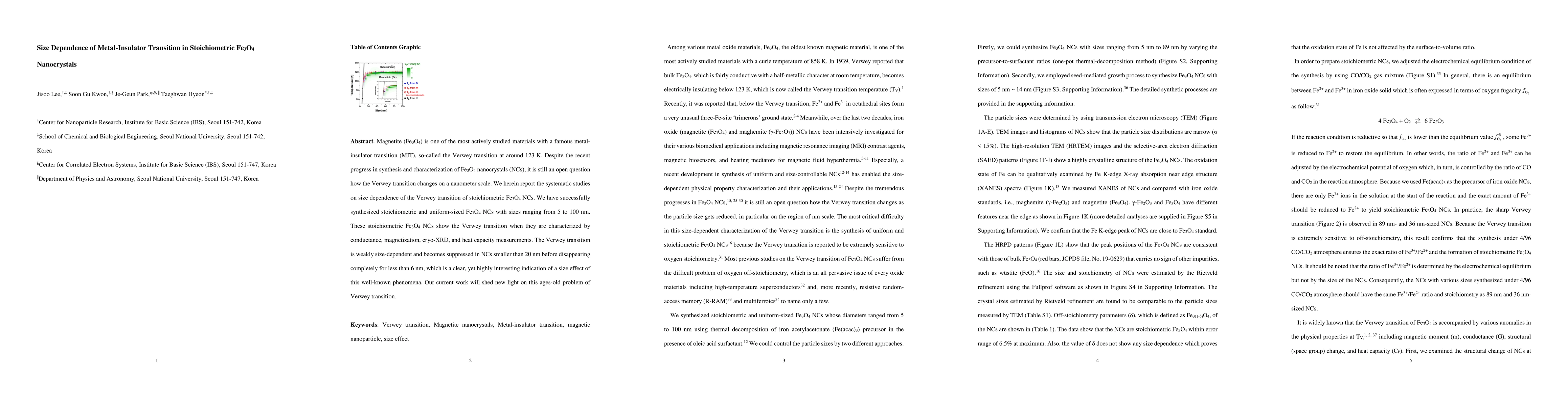 This study investigates the size-dependent metal-insulator transition in stoichiometric Fe3O4 nanocrystals, revealing that the transition is suppressed in crystals smaller than 20 nm and disappears entirely for sizes below 6 nm, indicating a significant size effect on the Verwey transition.