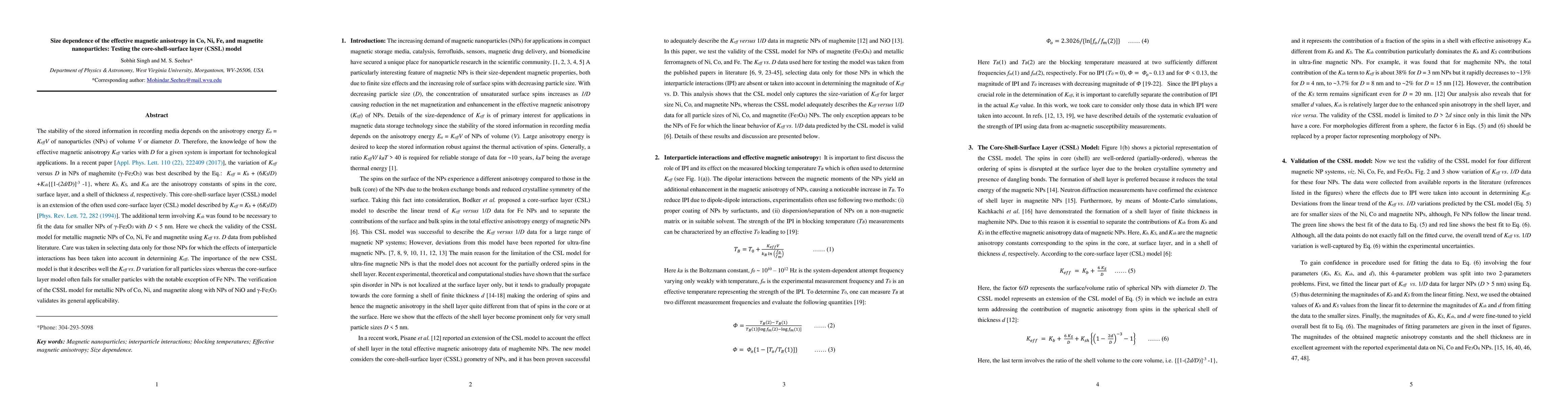 The stability of the stored information in recording media depends on the anisotropy energy Ea = KeffV of nanoparticles (NPs) of volume V or diameter D. Therefore, the knowledge of how the effective magnetic anisotropy Keff varies with D for a given system is important for technological applications. In a recent paper [Appl. Phys. Lett. 110 (22), 222409 (2017)], the variation of Keff versus D in NPs of maghemite ({\gamma}-Fe2O3) was best described by the Eq.: Keff = Kb + (6KS/D) +Ksh{[1-(2d/D)]-3 -1}, where Kb, KS, and Ksh are the anisotropy constants of spins in the core, surface layer, and a shell of thickness d, respectively. This core-shell-surface layer (CSSL) model is an extension of the often used core-surface layer (CSL) model described by Keff = Kb + (6KS/D) [Phys. Rev. Lett. 72, 282 (1994)]. The additional term involving Ksh was found to be necessary to fit the data for smaller NPs of {\gamma}-Fe2O3 with D < 5 nm. Here we check the validity of the CSSL model for metallic magnetic NPs of Co, Ni, Fe and magnetite using Keff vs. D data from published literature. Care was taken in selecting data only for those NPs for which the effects of interparticle interactions has been taken into account in determining Keff. The importance of the new CSSL model is that it describes well the Keff vs. D variation for all particles sizes whereas the core-surface layer model often fails for smaller particles with the notable exception of Fe NPs. The verification of the CSSL model for metallic NPs of Co, Ni, and magnetite along with NPs of NiO and {\gamma}-Fe2O3 validates its general applicability.