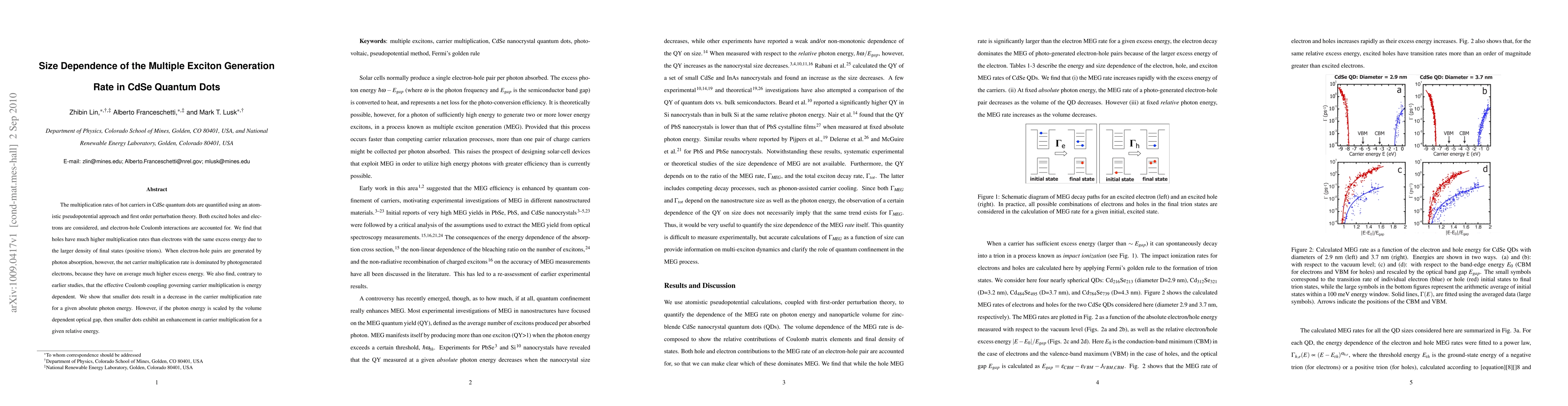 This study quantifies the size-dependent rates of multiple exciton generation in CdSe quantum dots, revealing that holes have higher multiplication rates due to more final states. Despite this, photogenerated electrons dominate the net multiplication rate due to higher excess energy, and the effective Coulomb coupling is found to be energy-dependent, with smaller dots showing enhanced multiplication when photon energy is normalized by the optical gap.
