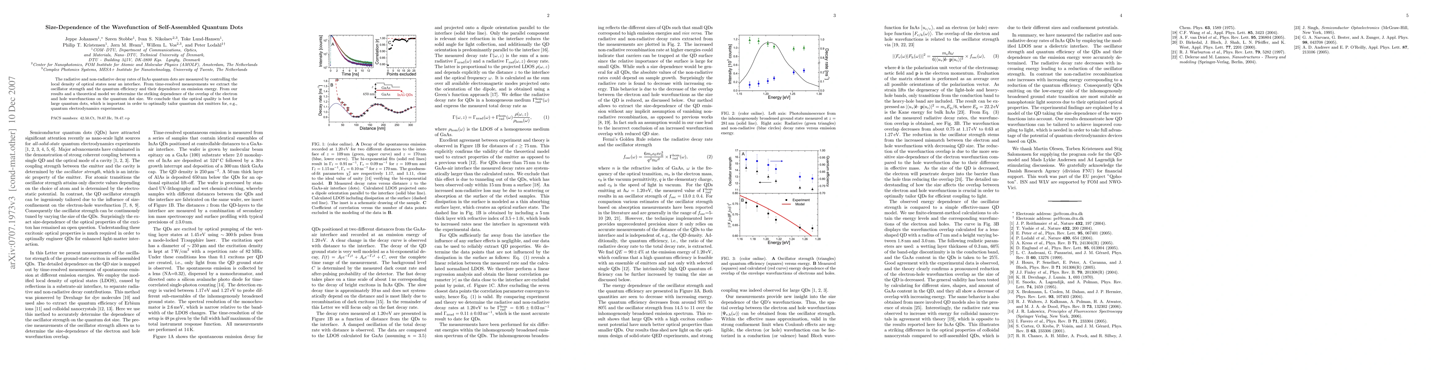 The radiative and non-radiative decay rates of InAs quantum dots are measured by controlling the local density of optical states near an interface. From time-resolved measurements we extract the oscillator strength and the quantum efficiency and their dependence on emission energy. From our results and a theoretical model we determine the striking dependence of the overlap of the electron and hole wavefunctions on the quantum dot size. We conclude that the optical quality is best for large quantum dots, which is important in order to optimally tailor quantum dot emitters for, e.g., quantum electrodynamics experiments.