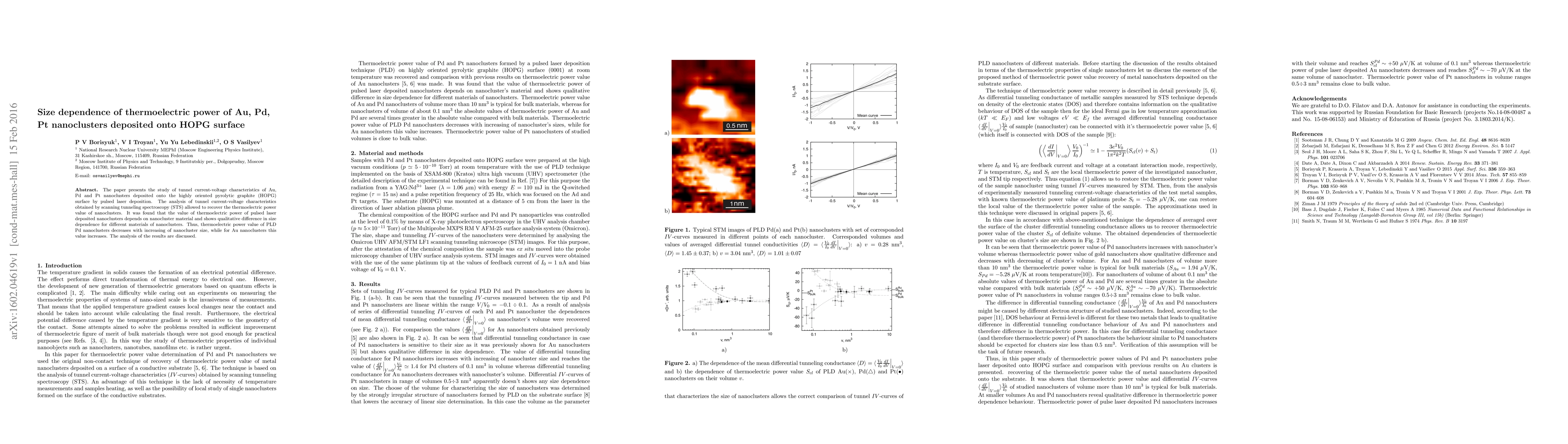 Researchers studied thermoelectric power in gold, palladium, and platinum nanoclusters deposited on a graphite surface, finding that size dependence varies among the materials with Au showing an increase and Pd showing a decrease.