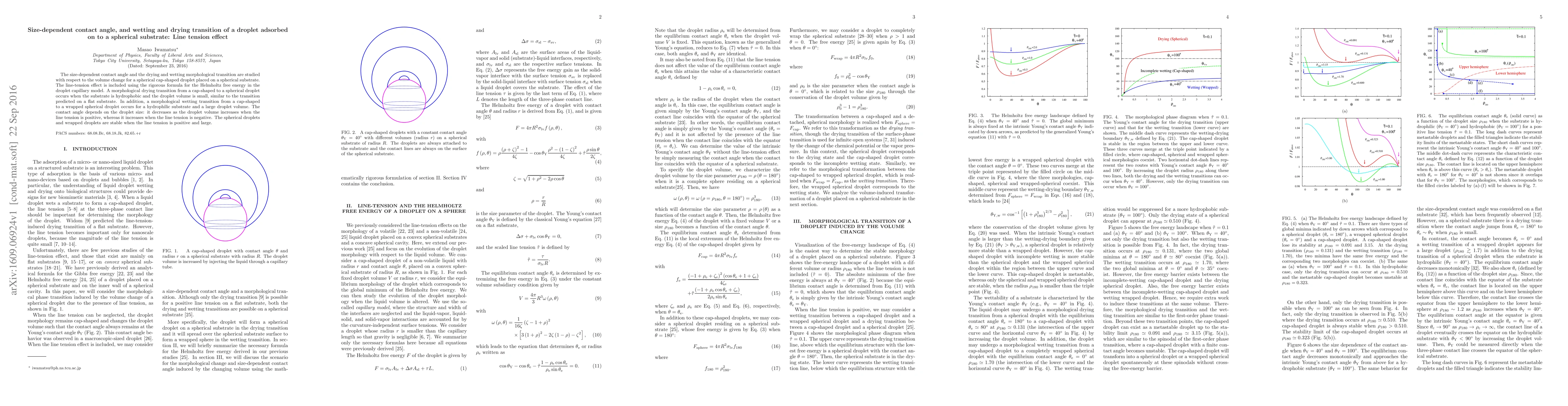 The size-dependent contact angle and the drying and wetting morphological transition are studied with respect to the volume change for a spherical cap-shaped droplet placed on a spherical substrate. The line-tension effect is included using the rigorous formula for the Helmholtz free energy in the droplet capillary model. A morphological drying transition from a cap-shaped to a spherical droplet occurs when the substrate is hydrophobic and the droplet volume is small, similar to the transition predicted on a flat substrate. In addition, a morphological wetting transition from a cap-shaped to a wrapped spherical droplet occurs for a hydrophilic substrate and a large droplet volume. The contact angle depends on the droplet size: it decreases as the droplet volume increases when the line tension is positive, whereas it increases when the line tension is negative. The spherical droplets and wrapped droplets are stable when the line tension is positive and large.