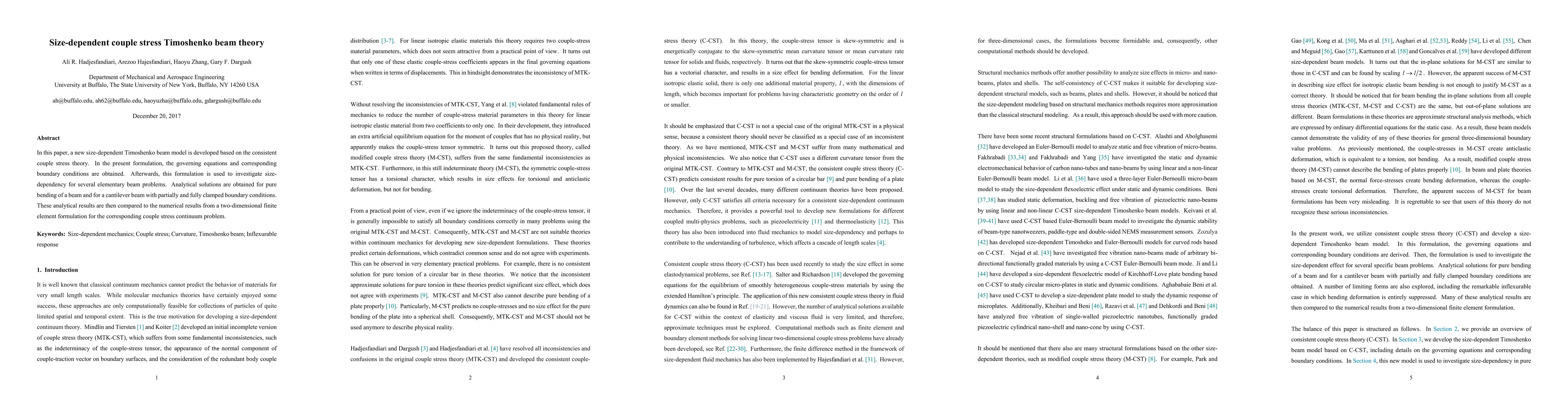 This paper develops a size-dependent Timoshenko beam model based on couple stress theory, deriving governing equations and boundary conditions. Analytical solutions for bending and clamped beam problems are compared with numerical finite element results to assess size-dependency effects.