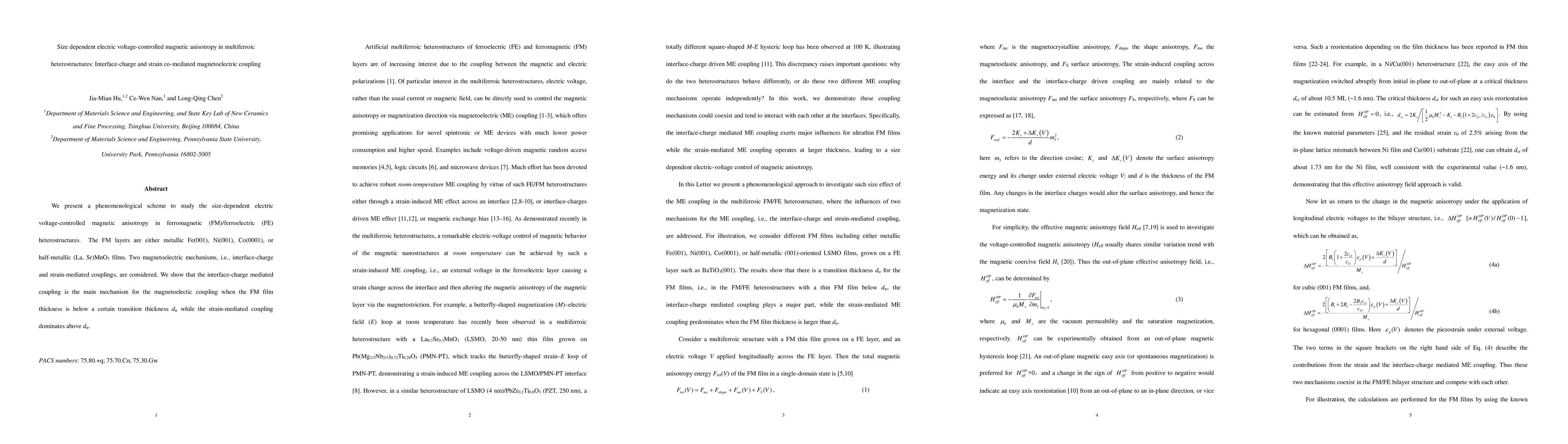 The study investigates size-dependent electric voltage control of magnetic anisotropy in multiferroic heterostructures, highlighting the transition between interface-charge and strain-mediated magnetoelectric coupling based on ferromagnetic film thickness. Below a critical thickness, interface-charge coupling dominates, while above it, strain-mediated coupling becomes the primary mechanism.