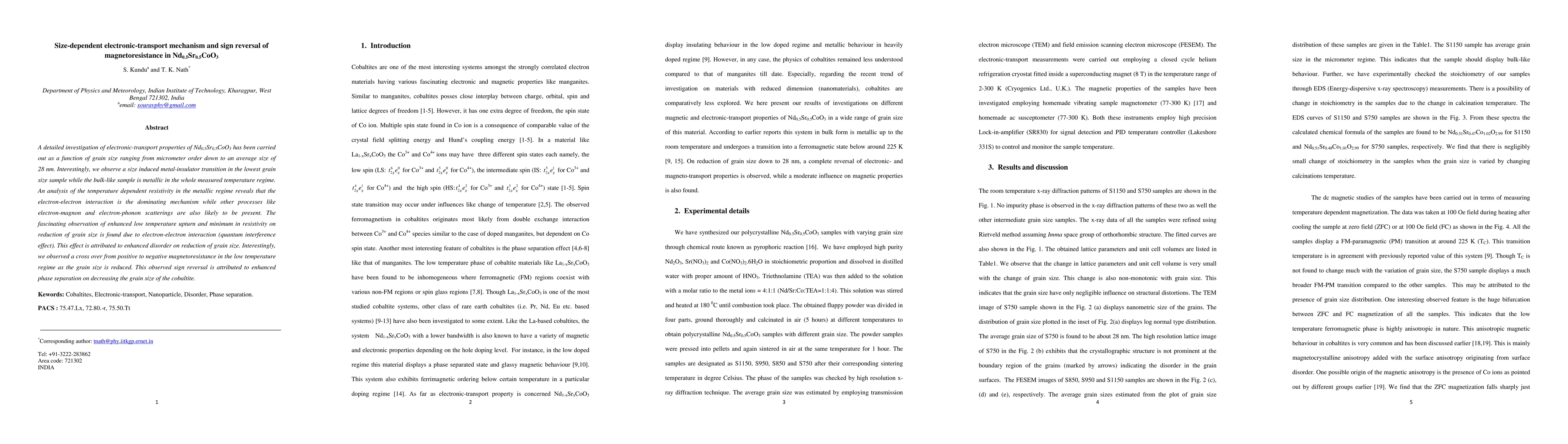 A detailed investigation of electronic-transport properties of Nd0.5Sr0.5CoO3 has been carried out as a function of grain size ranging from micrometer order down to an average size of 28 nm. Interestingly, we observe a size induced metal-insulator transition in the lowest grain size sample while the bulk-like sample is metallic in the whole measured temperature regime. An analysis of the temperature dependent resistivity in the metallic regime reveals that the electron-electron interaction is the dominating mechanism while other processes like electron-magnon and electron-phonon scatterings are also likely to be present. The fascinating observation of enhanced low temperature upturn and minimum in resistivity on reduction of grain size is found due to electron-electron interaction (quantum interference effect). This effect is attributed to enhanced disorder on reduction of grain size. Interestingly, we observed a cross over from positive to negative magnetoresistance in the low temperature regime as the grain size is reduced. This observed sign reversal is attributed to enhanced phase separation on decreasing the grain size of the cobaltite.