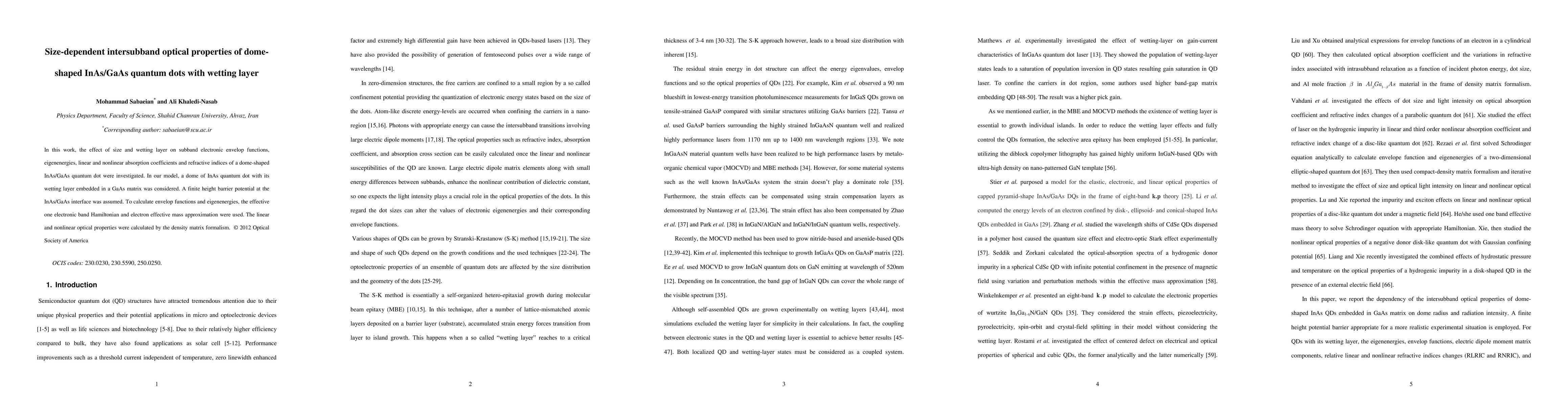 This study investigates how the size and wetting layer influence the electronic and optical properties of dome-shaped InAs/GaAs quantum dots, using a model with a finite height barrier potential and effective mass approximation. The research calculates subband electronic envelope functions, eigenenergies, and linear and nonlinear optical properties via the density matrix formalism.