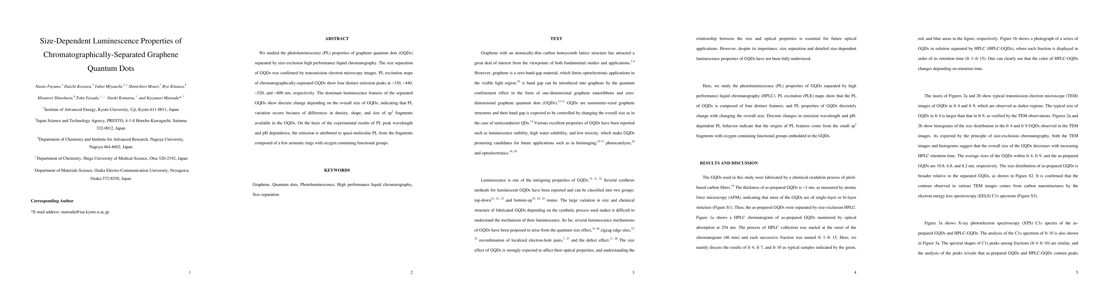 We studied the photoluminescence (PL) properties of graphene quantum dots (GQDs) separated by size-exclusion high performance liquid chromatography. The size separation of GQDs was confirmed by transmission electron microcopy images. PL excitation maps of chromatographically-separated GQDs show four distinct emission peaks at 330, 440, 520, and 600 nm, respectively. The dominant luminescence features of the separated GQDs show discrete change depending on the overall size of GQDs, indicating that PL variation occurs because of differences in density, shape, and size of sp2 fragments available in the GQDs. On the basis of the experimental results of PL peak wavelength and pH dependence, the emission is attributed to quasi-molecular PL from the fragments composed of a few aromatic rings with oxygen containing functional groups.