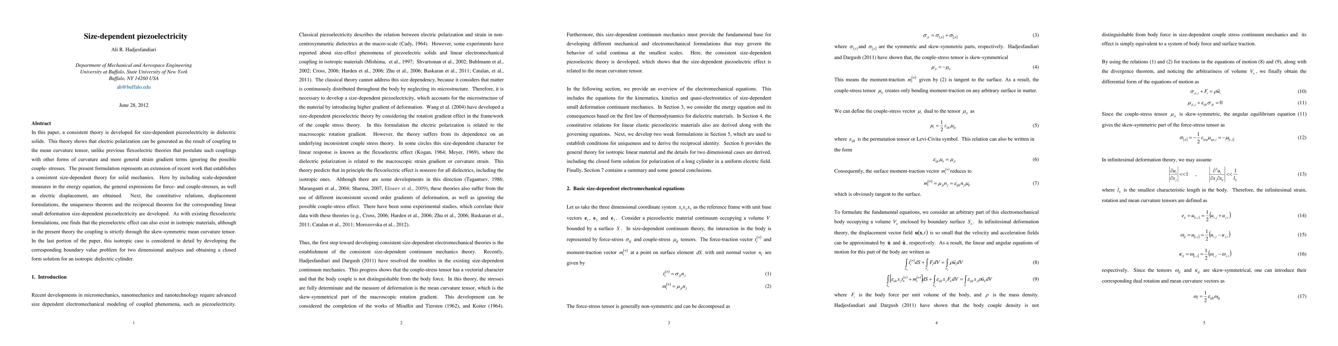 In this paper, a consistent theory is developed for size-dependent piezoelectricity in dielectric solids. This theory shows that electric polarization can be generated as the result of coupling to the mean curvature tensor, unlike previous flexoelectric theories that postulate such couplings with other forms of curvature and more general strain gradient terms ignoring the possible couple- stresses. The present formulation represents an extension of recent work that establishes a consistent size-dependent theory for solid mechanics. Here by including scale-dependent measures in the energy equation, the general expressions for force- and couple-stresses, as well as electric displacement, are obtained. Next, the constitutive relations, displacement formulations, the uniqueness theorem and the reciprocal theorem for the corresponding linear small deformation size-dependent piezoelectricity are developed. As with existing flexoelectric formulations, one finds that the piezoelectric effect can also exist in isotropic materials, although in the present theory the coupling is strictly through the skew-symmetric mean curvature tensor. In the last portion of the paper, this isotropic case is considered in detail by developing the corresponding boundary value problem for two dimensional analyses and obtaining a closed form solution for an isotropic dielectric cylinder.