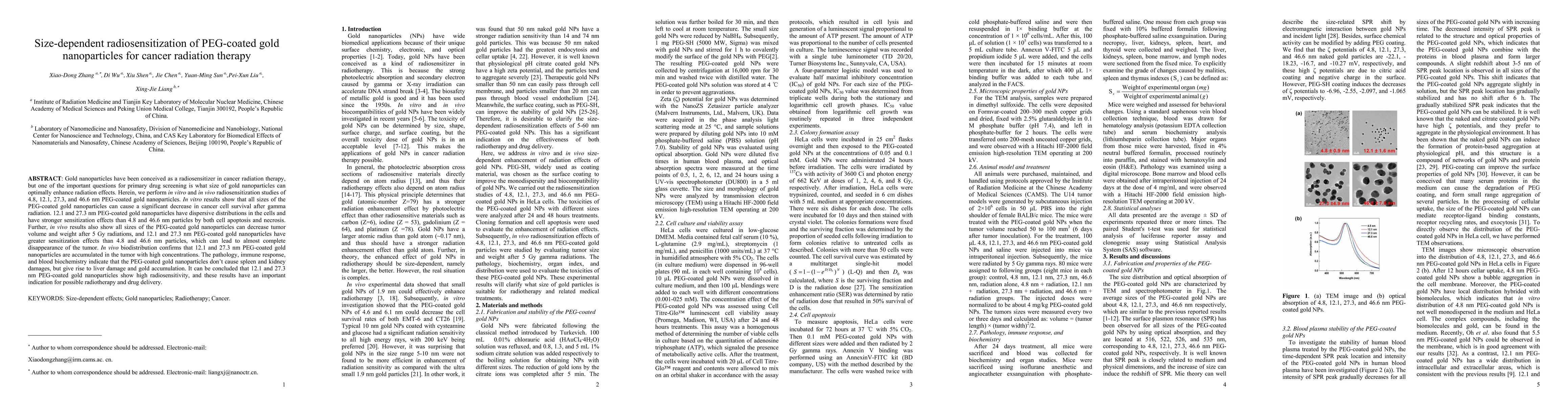This study investigates the radiosensitization effect of PEG-coated gold nanoparticles of varying sizes (4.8, 12.1, 27.3, and 46.6 nm) in cancer radiation therapy, finding that 12.1 and 27.3 nm particles provide stronger effects both in vitro and in vivo, leading to significant tumor reduction with minimal organ damage.