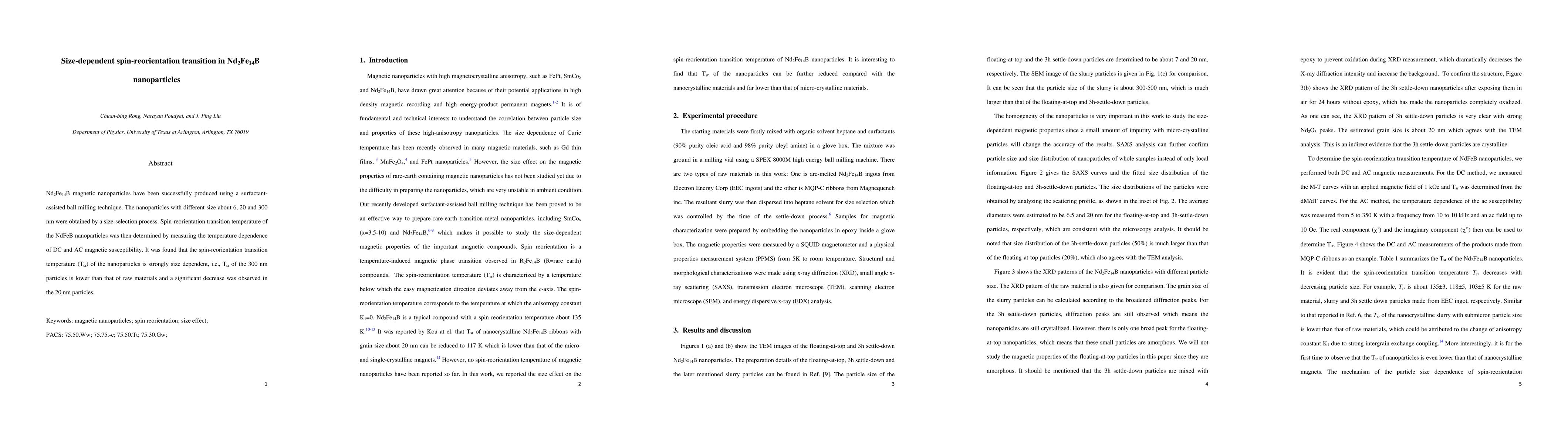 Nd2Fe14B magnetic nanoparticles of varying sizes were synthesized using surfactant-assisted ball milling. The size-dependent spin-reorientation transition temperature (Tsr) was found to decrease significantly with decreasing particle size, indicating a strong size effect on magnetic properties.