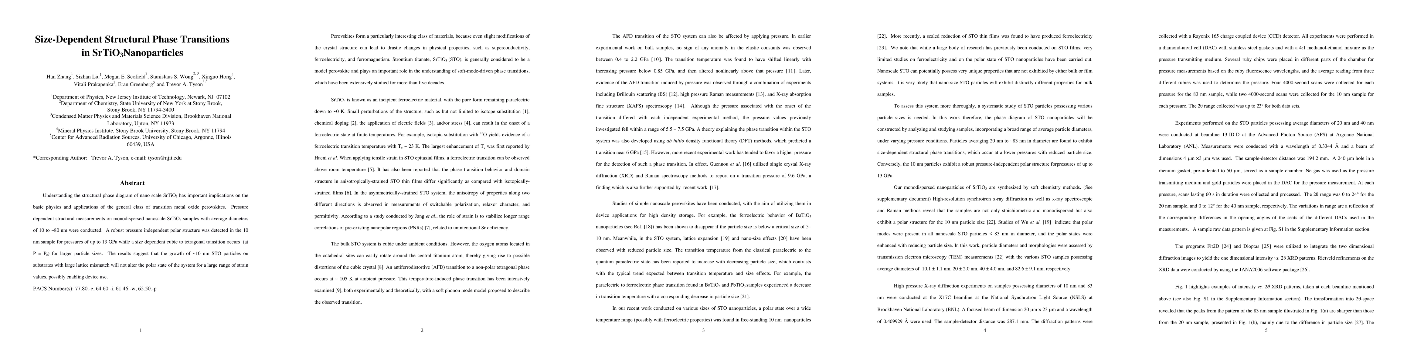 This study investigates size-dependent structural phase transitions in SrTiO3 nanoparticles under pressure, revealing a pressure-independent polar structure in 10 nm particles and a size-dependent cubic to tetragonal transition in larger particles, suggesting potential for device applications despite lattice mismatch.