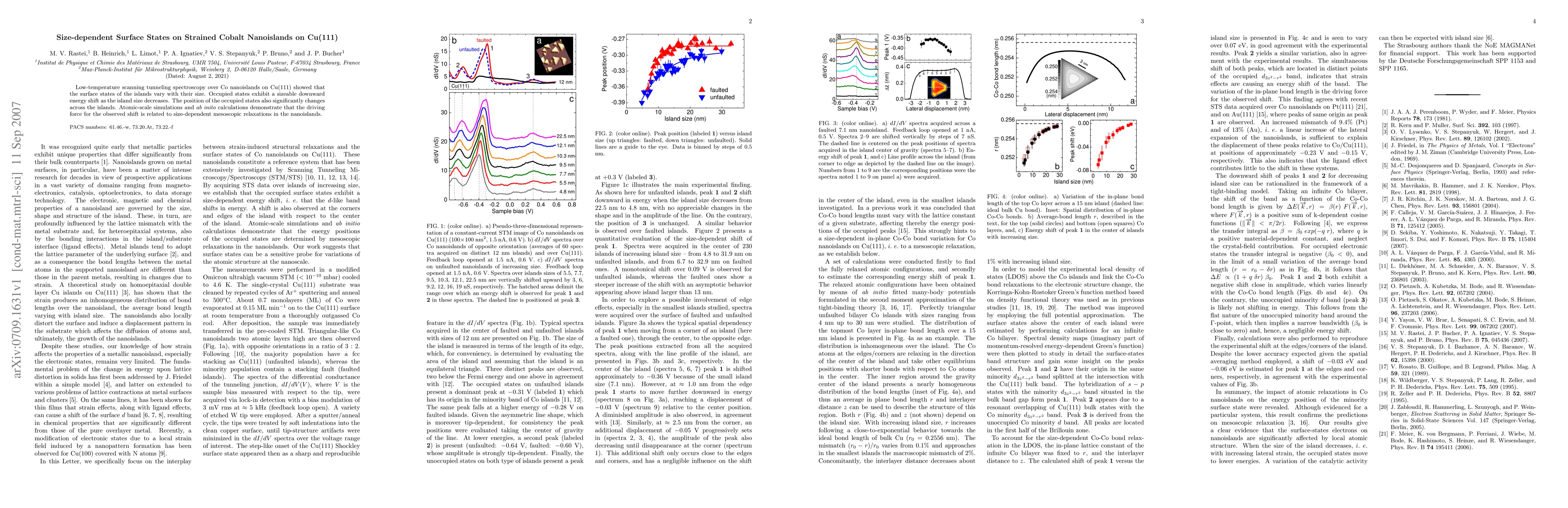 This study reveals that the surface states of cobalt nanoislands on Cu(111) shift downwards with decreasing island size, driven by mesoscopic relaxations, as shown by scanning tunneling spectroscopy and supported by simulations. The occupied states' positions vary significantly across islands of different sizes.