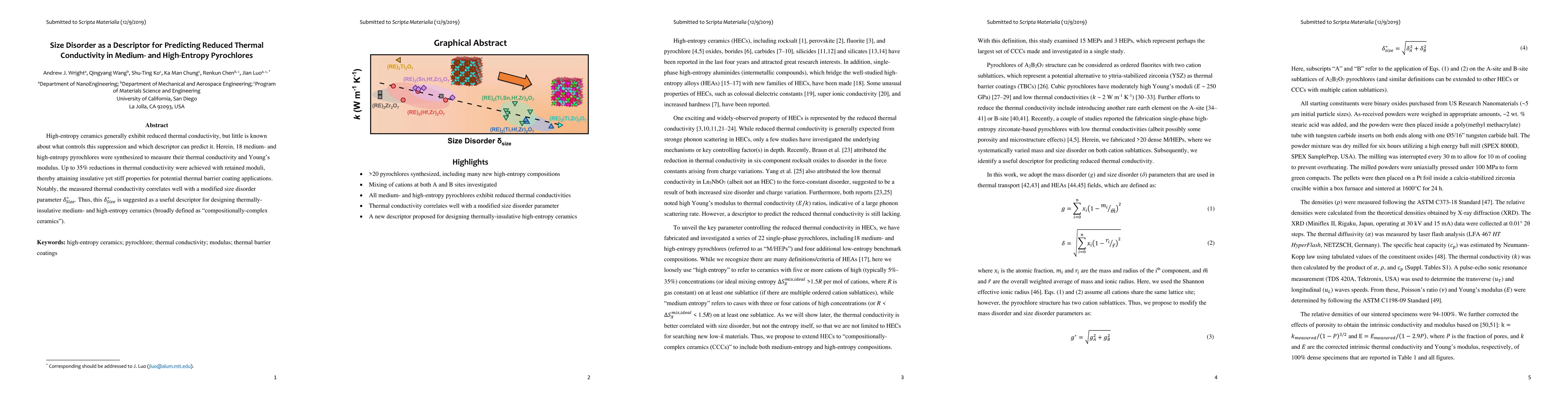 This study investigates the thermal conductivity of 18 medium- and high-entropy pyrochlores, finding up to 35% reductions with retained stiffness. The key descriptor for predicting these reductions is a modified size disorder parameter, suggesting its utility in designing thermally-insulative ceramics.