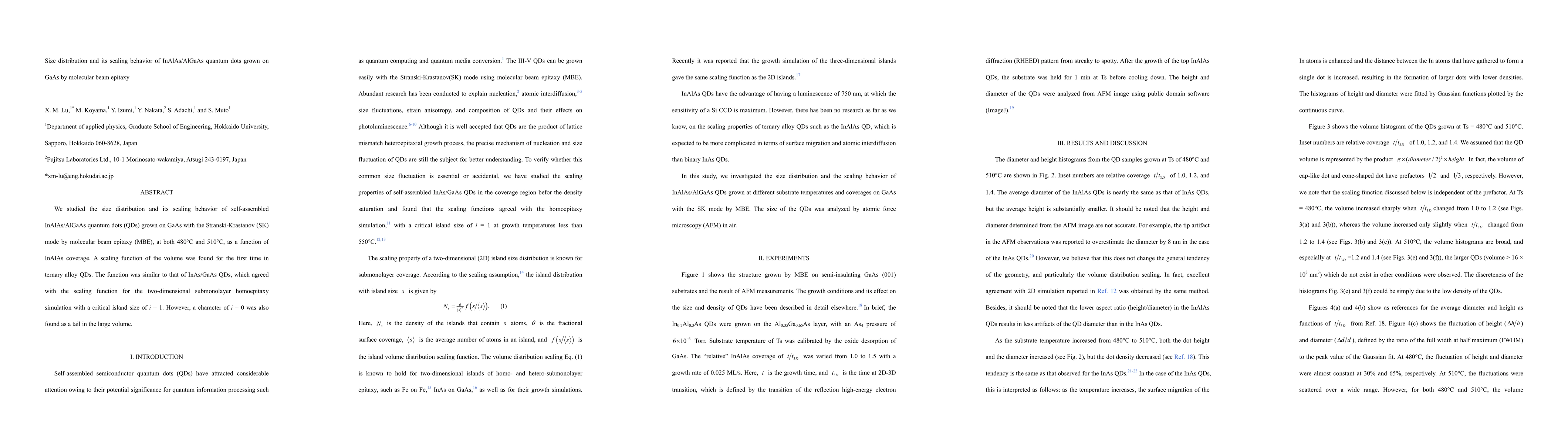 This paper investigates the size distribution and scaling behavior of self-assembled InAlAs/AlGaAs quantum dots grown on GaAs via molecular beam epitaxy, revealing a novel scaling function for ternary alloy quantum dots similar to InAs/GaAs QDs, with a critical island size of i = 1, but also exhibiting a tail at i = 0.