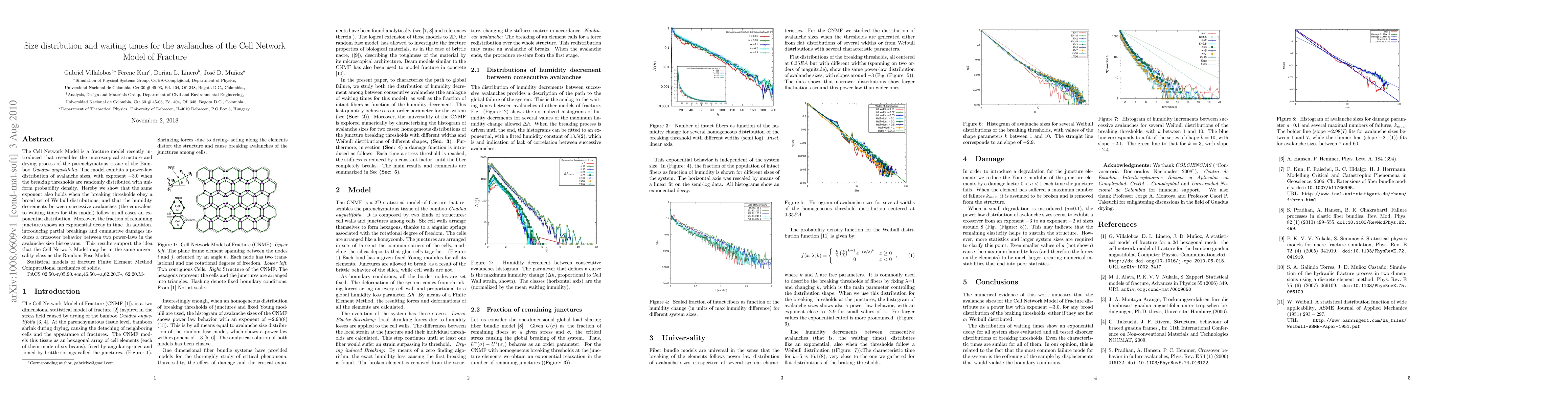 The Cell Network Model of Fracture exhibits a power-law distribution of avalanche sizes and exponential waiting times between successive avalanches, similar to the Random Fuse Model, supporting its universality class.