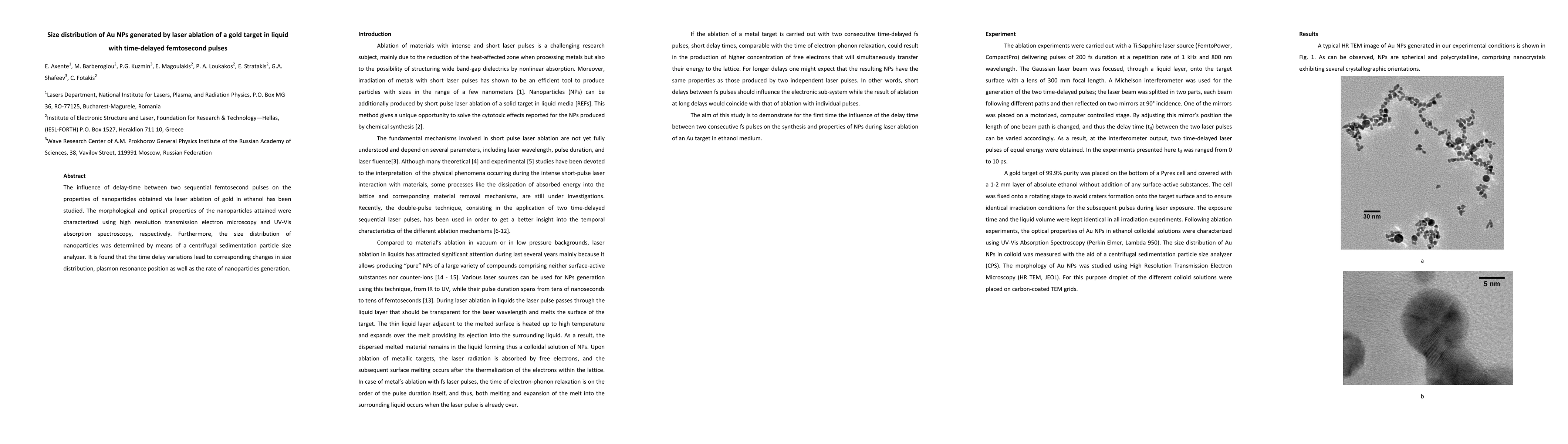 The influence of delay-time between two sequential femtosecond pulses on the properties of nanoparticles obtained via laser ablation of gold in ethanol has been studied. The morphological and optical properties of the nanoparticles attained were characterized using high resolution transmission electron microscopy and UV_Vis absorption spectroscopy, respectively. Furthermore, the size distribution of nanoparticles was determined by means of a centrifugal sedimentation particle size analyzer. It is found that the time delay variations lead to corresponding changes in size distribution, plasmon resonance position as well as the rate of nanoparticles generation.