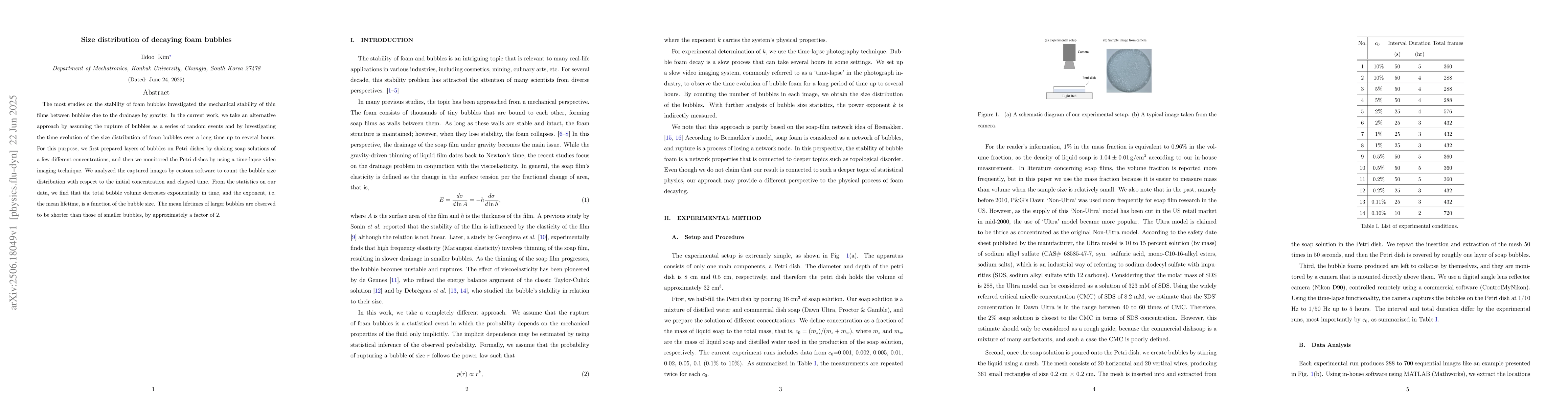 The most studies on the stability of foam bubbles investigated the mechanical stability of thin films between bubbles due to the drainage by gravity. In the current work, we take an alternative approach by assuming the rupture of bubbles as a series of random events and by investigating the time evolution of the size distribution of foam bubbles over a long time up to several hours. For this purpose, we first prepared layers of bubbles on Petri dishes by shaking soap solutions of a few different concentrations, and then we monitored the Petri dishes by using a time-lapse video imaging technique. We analyzed the captured images by custom software to count the bubble size distribution with respect to the initial concentration and elapsed time. From the statistics on our data, we find that the total bubble volume decreases exponentially in time, and the exponent, i.e. the mean lifetime, is a function of the bubble size. The mean lifetimes of larger bubbles are observed to be shorter than those of smaller bubbles, by approximately a factor of 2.