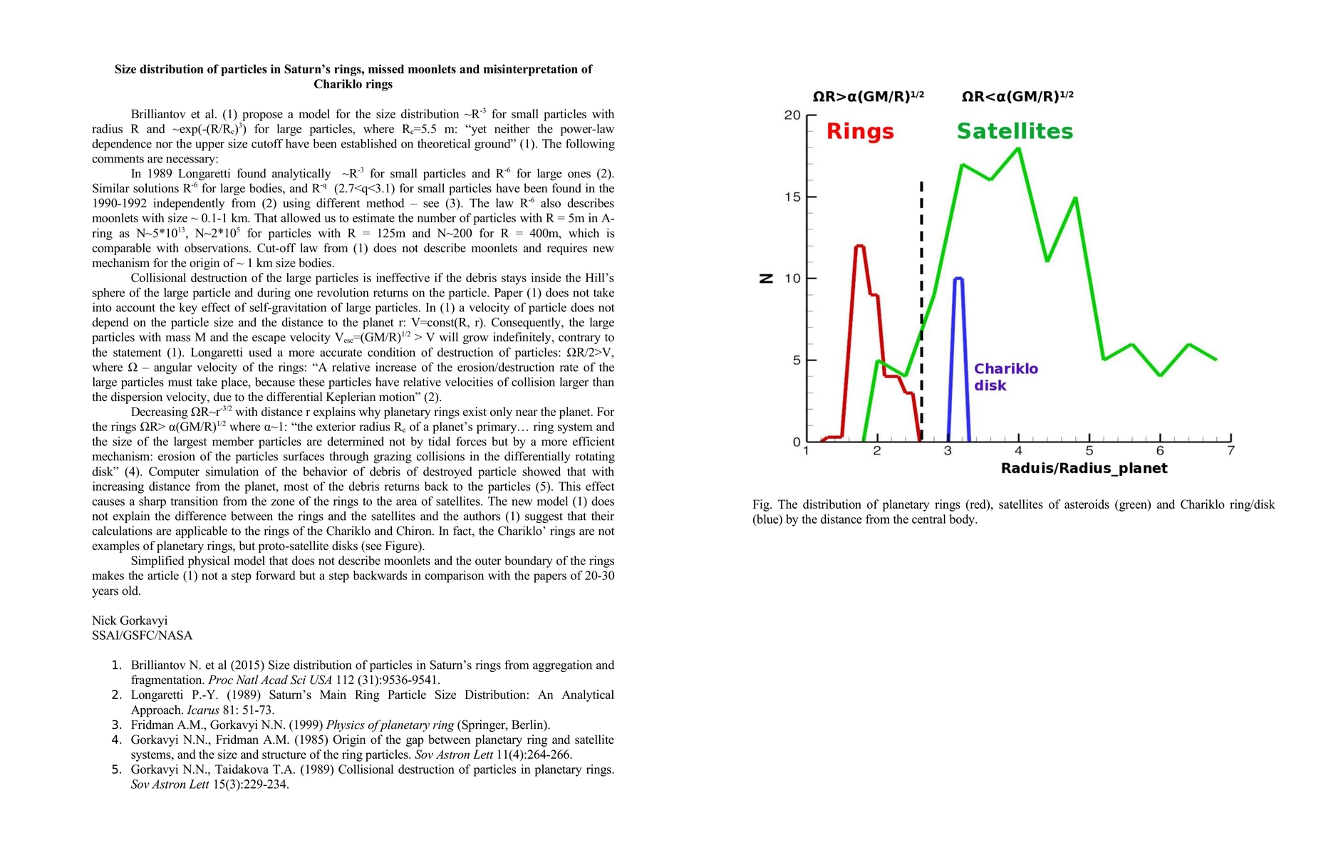 Brilliantov et al. propose a new model for particle size distribution in Saturn's rings, but it fails to account for moonlets and the effects of self-gravitation and differential rotation. Longaretti's older model provides a more accurate description, highlighting the need for a revised approach to understand Saturn's rings and similar structures like Chariklo's rings.