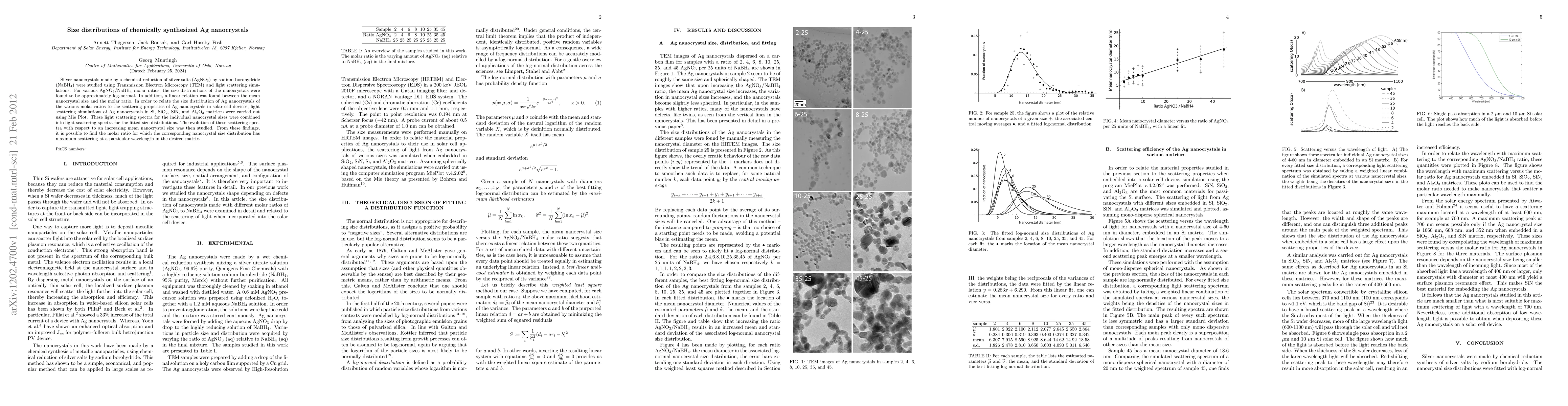 The paper presents a method for synthesizing Ag nanocrystals with controllable sizes and demonstrates their size-dependent scattering properties in various matrices, crucial for solar cell optimization.