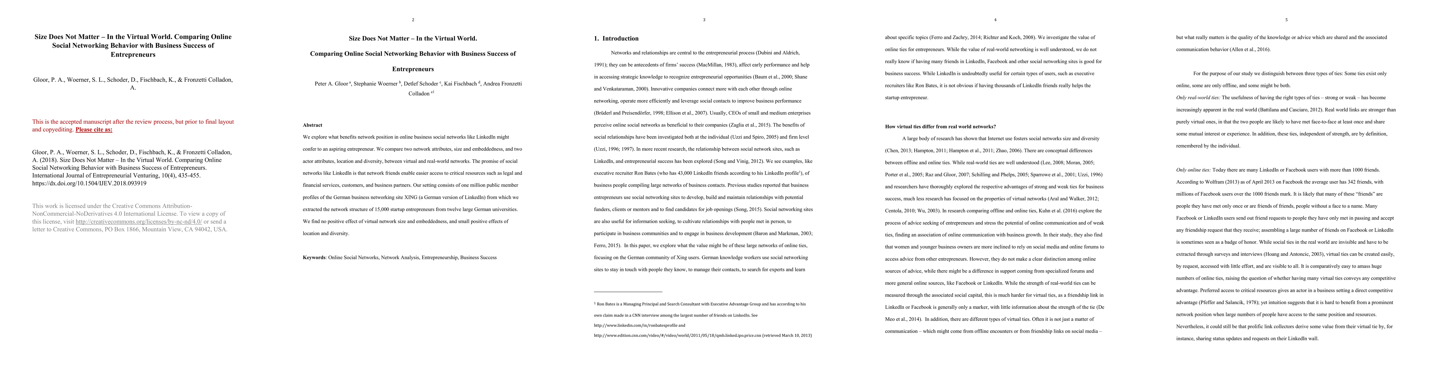We explore what benefits network position in online business social networks like LinkedIn might confer to an aspiring entrepreneur. We compare two network attributes, size and embeddedness, and two actor attributes, location and diversity, between virtual and real-world networks. The promise of social networks like LinkedIn is that network friends enable easier access to critical resources such as legal and financial services, customers, and business partners. Our setting consists of one million public member profiles of the German business networking site XING (a German version of LinkedIn) from which we extracted the network structure of 15,000 start-up entrepreneurs from 12 large German universities. We find no positive effect of virtual network size and embeddedness, and small positive effects of location and diversity.