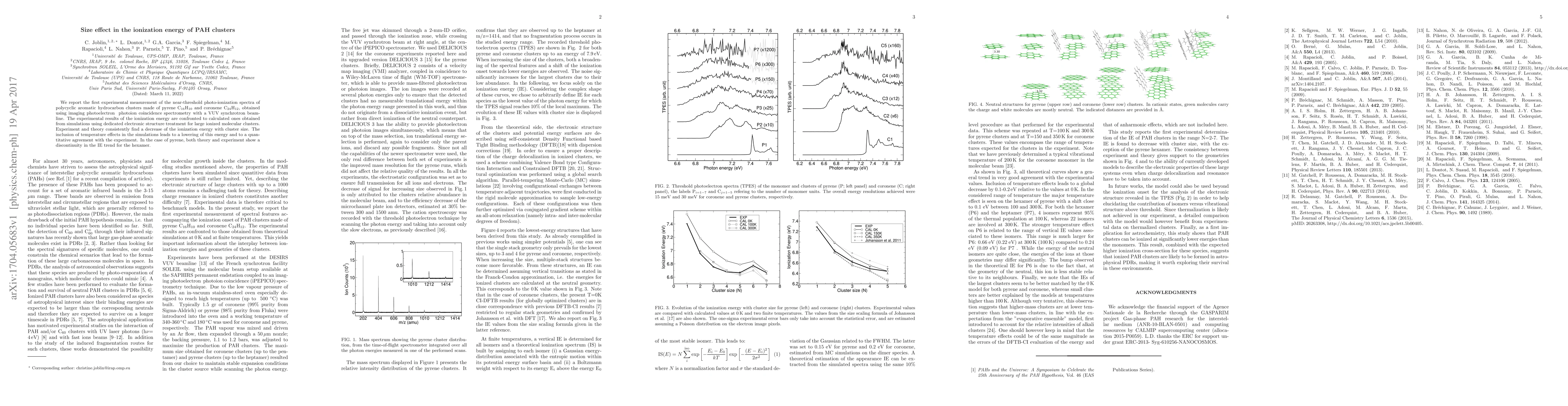 We report the first experimental measurement of the near-threshold photo-ionization spectra of polycyclic aromatic hydrocarbon clusters made of pyrene C16H10 and coronene C24H12, obtained using imaging photoelectron photoion coincidence spectrometry with a VUV synchrotron beamline. The experimental results of the ionization energy are confronted to calculated ones obtained from simulations using dedicated electronic structure treatment for large ionized molecular clusters. Experiment and theory consistently find a decrease of the ionization energy with cluster size. The inclusion of temperature effects in the simulations leads to a lowering of this energy and to a quantitative agreement with the experiment. In the case of pyrene, both theory and experiment show a discontinuity in the IE trend for the hexamer.