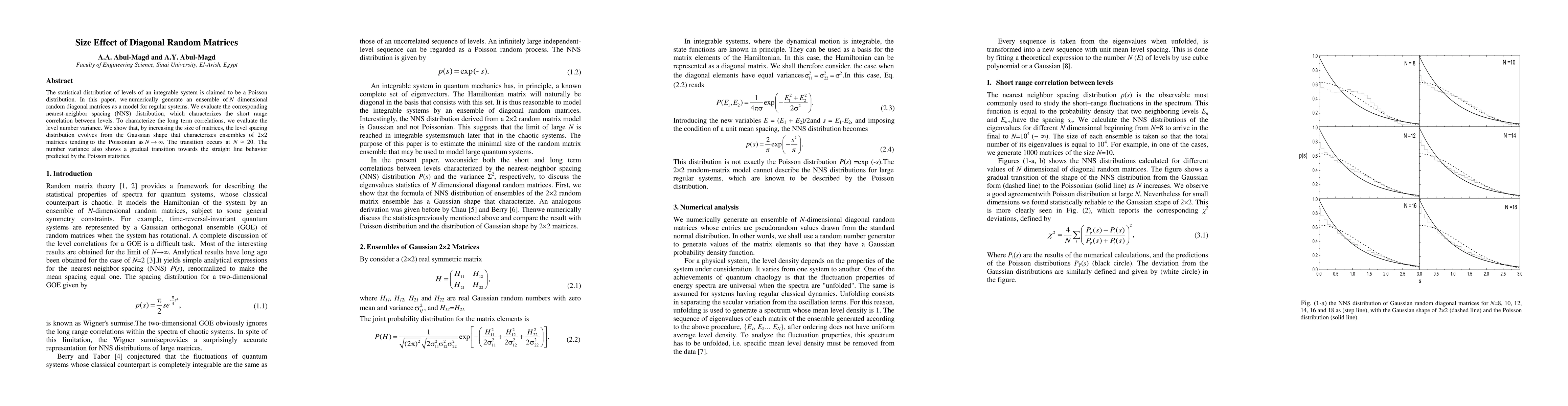 Numerical study of size effect on level spacing distribution in N-dimensional random diagonal matrices reveals a transition from Gaussian to Poissonian behavior at N around 20, indicating the emergence of long-term correlations as matrix size increases.