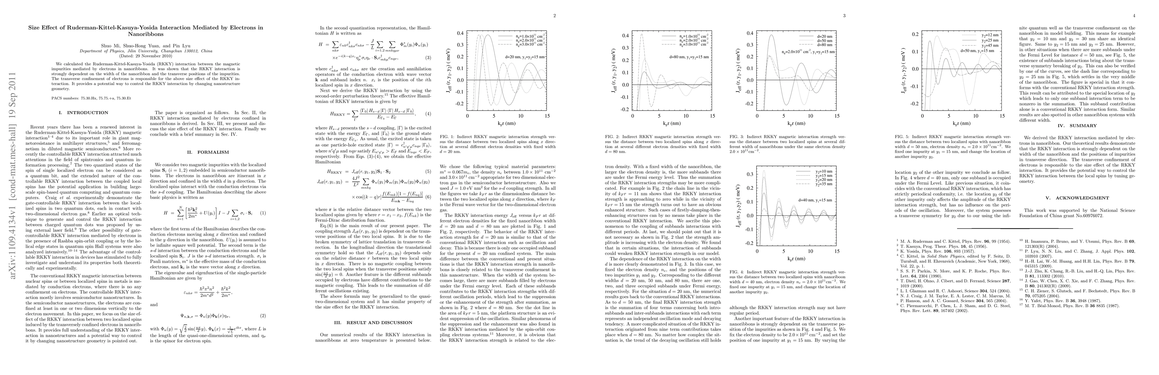 This research investigates the RKKY interaction between magnetic impurities mediated by electrons in nanoribbons, demonstrating a strong dependence on the nanoribbon width and impurity positions. The study reveals that electron confinement influences the RKKY interaction, offering a method to manipulate it via nanostructure geometry changes.