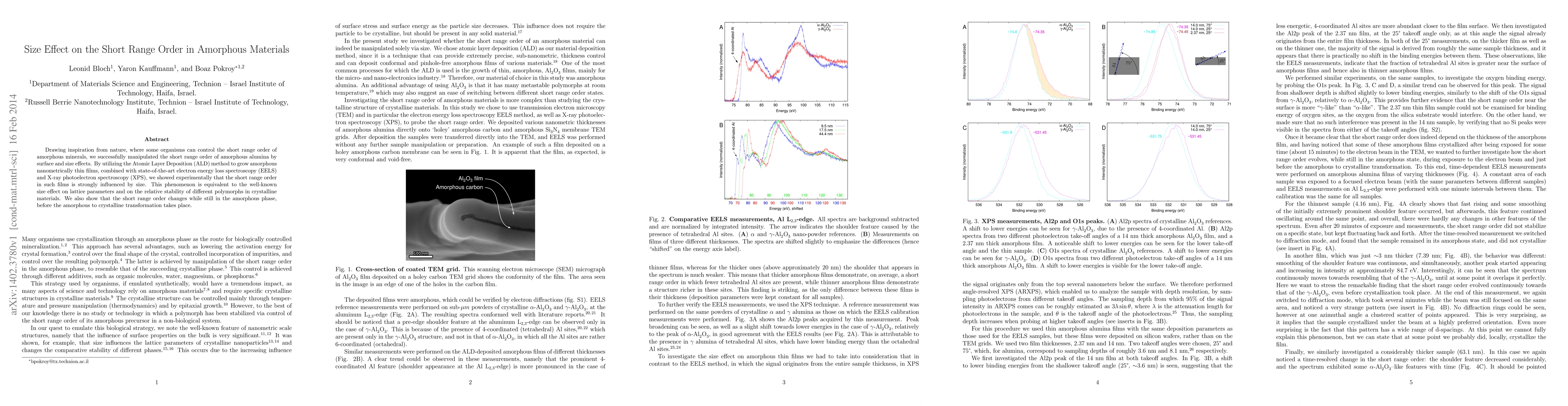 This paper demonstrates that size effects significantly influence the short range order in amorphous alumina films grown via Atomic Layer Deposition, using advanced spectroscopic techniques. The study reveals that the short range order changes even before the amorphous-to-crystalline transition, akin to size effects observed in crystalline materials.