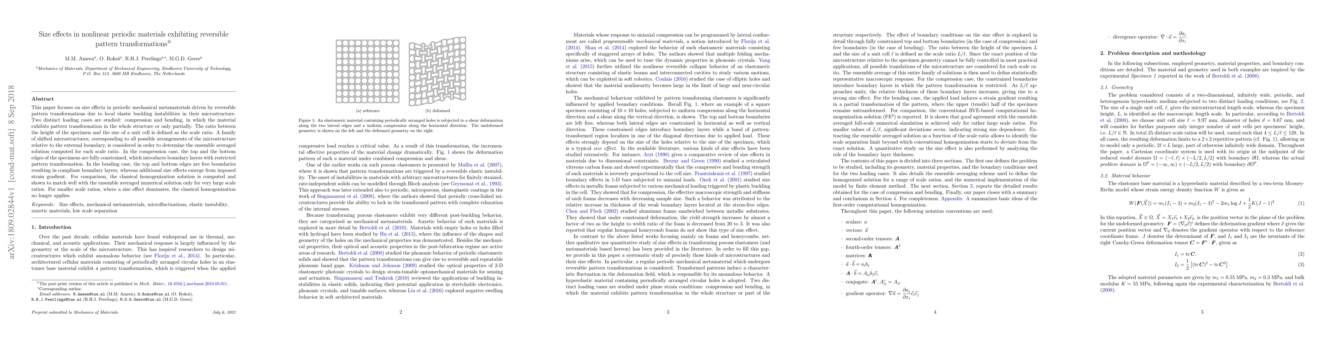 This paper focuses on size effects in periodic mechanical metamaterials driven by reversible pattern transformations due to local elastic buckling instabilities in their microstructure. Two distinct loading cases are studied: compression and bending, in which the material exhibits pattern transformation in the whole structure or only partially. The ratio between the height of the specimen and the size of a unit cell is defined as the scale ratio. A family of shifted microstructures, corresponding to all possible arrangements of the microstructure relative to the external boundary, is considered in order to determine the ensemble averaged solution computed for each scale ratio. In the compression case, the top and the bottom edges of the specimens are fully constrained, which introduces boundary layers with restricted pattern transformation. In the bending case, the top and bottom edges are free boundaries resulting in compliant boundary layers, whereas additional size effects emerge from imposed strain gradient. For comparison, the classical homogenization solution is computed and shown to match well with the ensemble averaged numerical solution only for very large scale ratios. For smaller scale ratios, where a size effect dominates, the classical homogenization no longer applies.