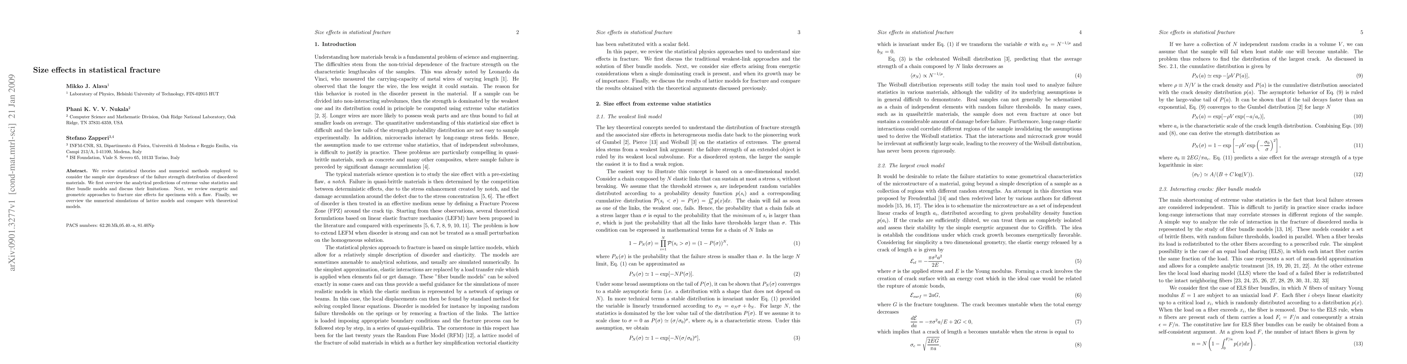 We review statistical theories and numerical methods employed to consider the sample size dependence of the failure strength distribution of disordered materials. We first overview the analytical predictions of extreme value statistics and fiber bundle models and discuss their limitations. Next, we review energetic and geometric approaches to fracture size effects for specimens with a flaw. Finally, we overview the numerical simulations of lattice models and compare with theoretical models.