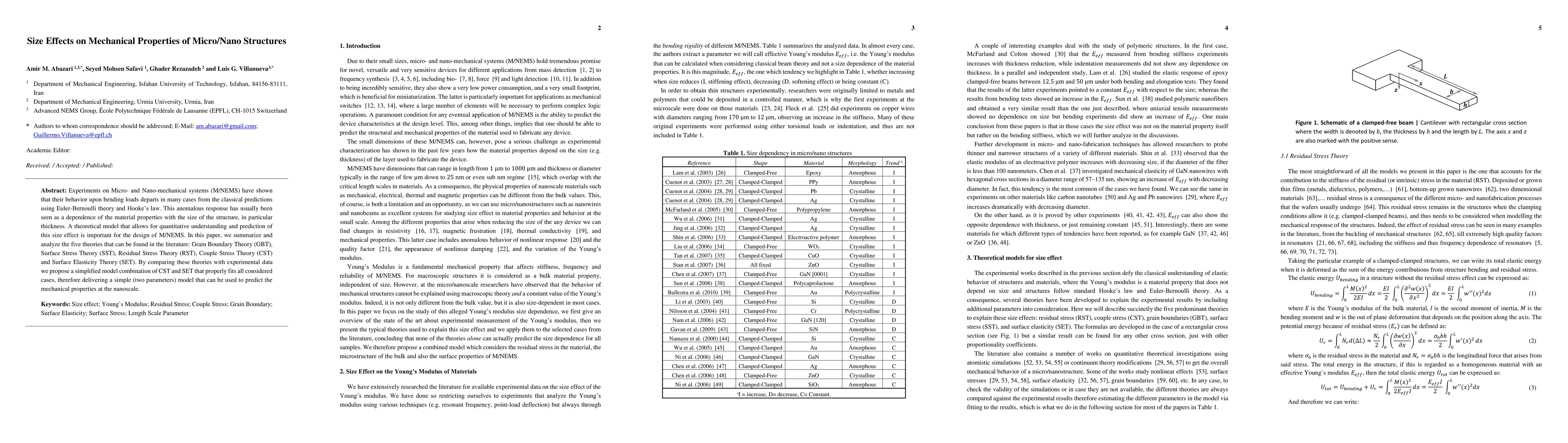 This paper explores size effects on the mechanical properties of micro/nano structures, comparing five existing theories to explain anomalous bending behavior. It proposes a simplified model combining Couple Stress Theory and Surface Elasticity Theory, offering a two-parameter model for predicting nanoscale mechanical properties.