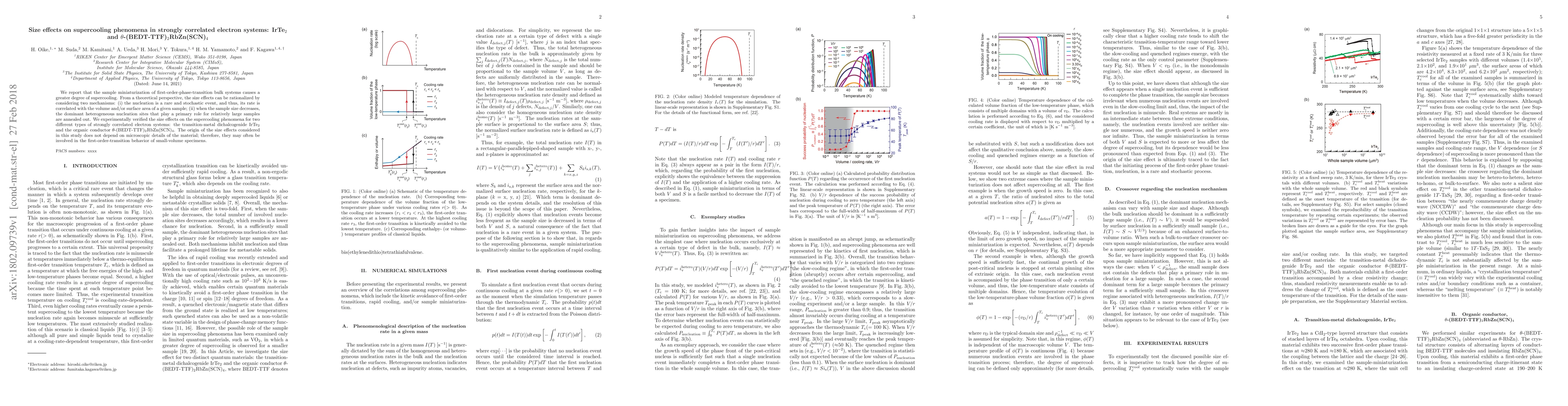 We report that the sample miniaturization of first-order-phase-transition bulk systems causes a greater degree of supercooling. From a theoretical perspective, the size effects can be rationalized by considering two mechanisms: (i) the nucleation is a rare and stochastic event, and thus, its rate is correlated with the volume and/or surface area of a given sample; (ii) when the sample size decreases, the dominant heterogeneous nucleation sites that play a primary role for relatively large samples are annealed out. We experimentally verified the size effects on the supercooling phenomena for two different types of strongly correlated electron systems: the transition-metal dichalcogenide IrTe$_2$ and the organic conductor $\theta$-(BEDT-TTF)$_2$RbZn(SCN)$_4$. The origin of the size effects considered in this study does not depend on microscopic details of the material; therefore, they may often be involved in the first-order-transition behavior of small-volume specimens.