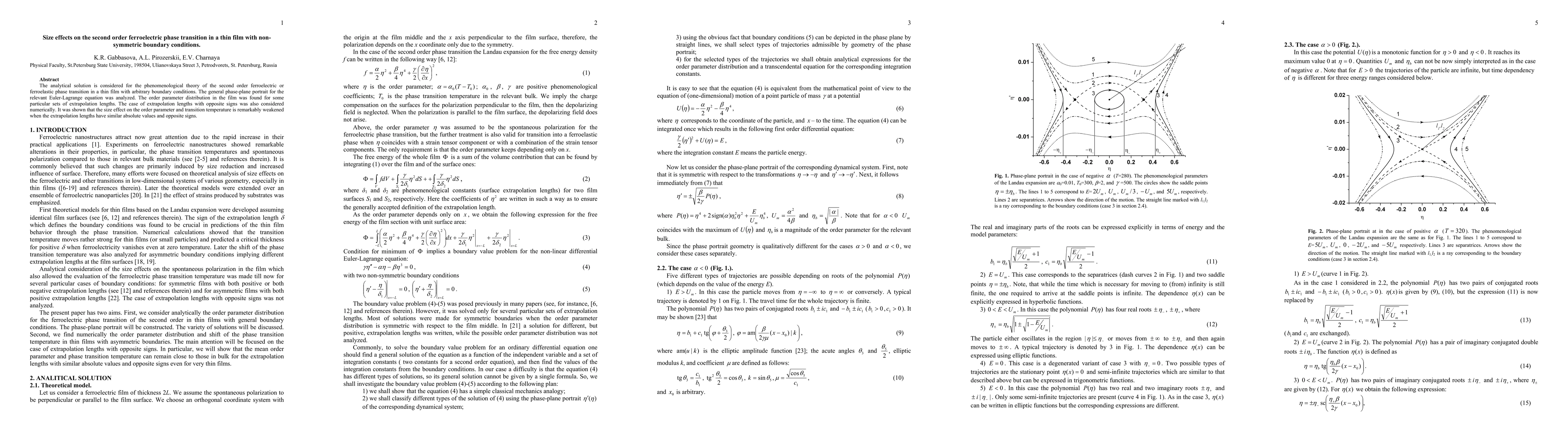 The analytical solution is considered for the phenomenological theory of the second order ferroelectric or ferroelastic phase transition in a thin film with arbitrary boundary conditions. The general phase-plane portrait for the relevant Euler-Lagrange equation was analyzed. The order parameter distribution in the film was found for some particular sets of extrapolation lengths. The case of extrapolation lengths with opposite signs was also considered numerically. It was shown that the size effect on the order parameter and transition temperature is remarkably weakened when the extrapolation lengths have similar absolute values and opposite signs.