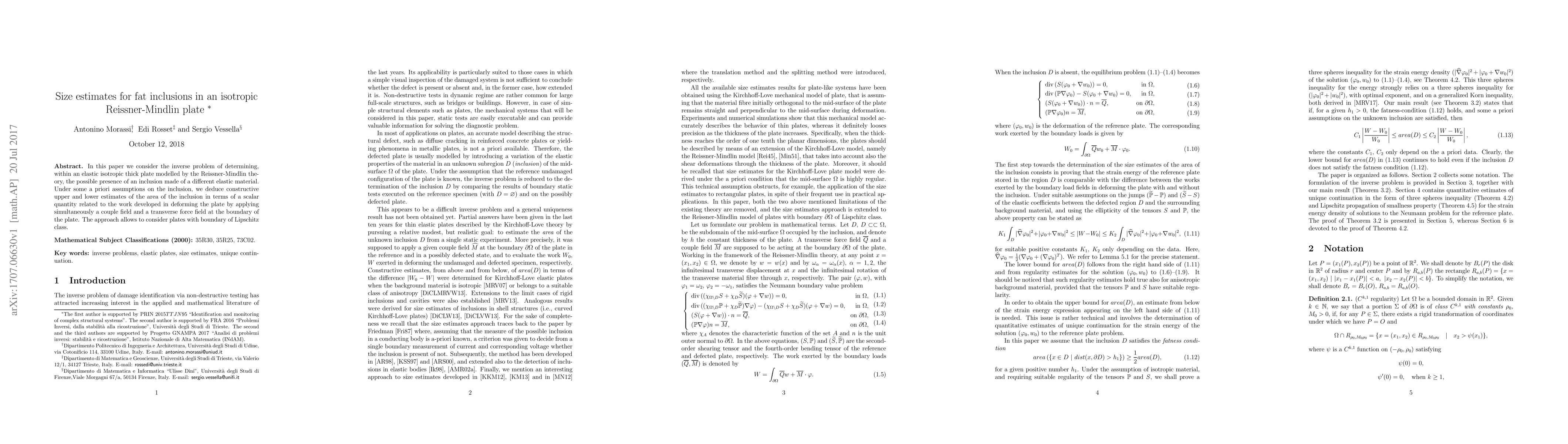 In this paper we consider the inverse problem of determining, within an elastic isotropic thick plate modelled by the Reissner-Mindlin theory, the possible presence of an inclusion made of a different elastic material. Under some a priori assumptions on the inclusion, we deduce constructive upper and lower estimates of the area of the inclusion in terms of a scalar quantity related to the work developed in deforming the plate by applying simultaneously a couple field and a transverse force field at the boundary of the plate. The approach allows to consider plates with boundary of Lipschitz class.