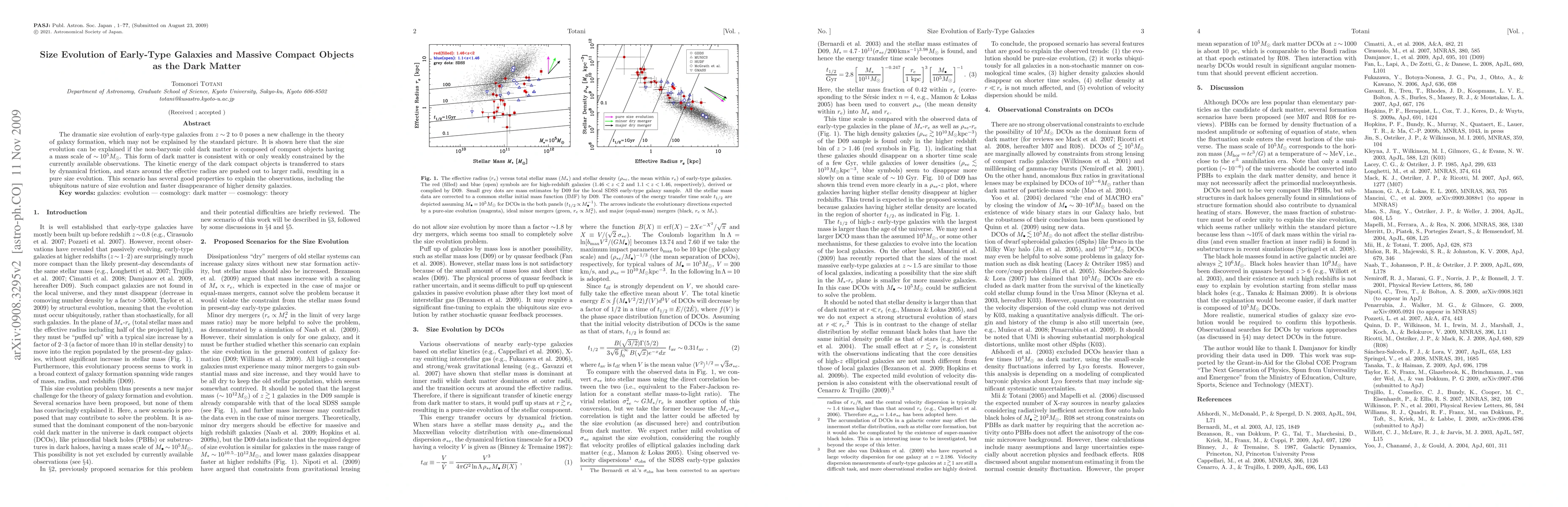 This paper proposes that the size evolution of early-type galaxies can be explained by non-baryonic cold dark matter composed of massive compact objects (~10^5 M_sun), which transfer kinetic energy to stars via dynamical friction, causing the galaxies to expand. This scenario aligns well with the observed size evolution and the disappearance of denser galaxies.