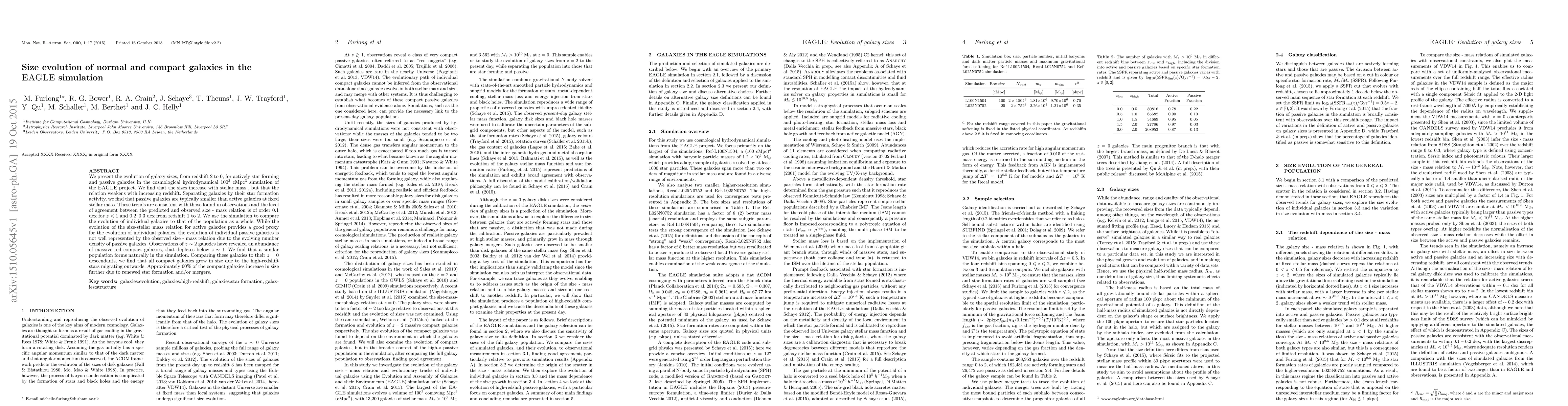 The EAGLE simulation reveals the evolution of galaxy sizes from redshift 2 to 0, showing that sizes increase with stellar mass but weaken with higher redshift. Passive galaxies are typically smaller than actively star-forming ones at fixed stellar mass, aligning with observational trends.