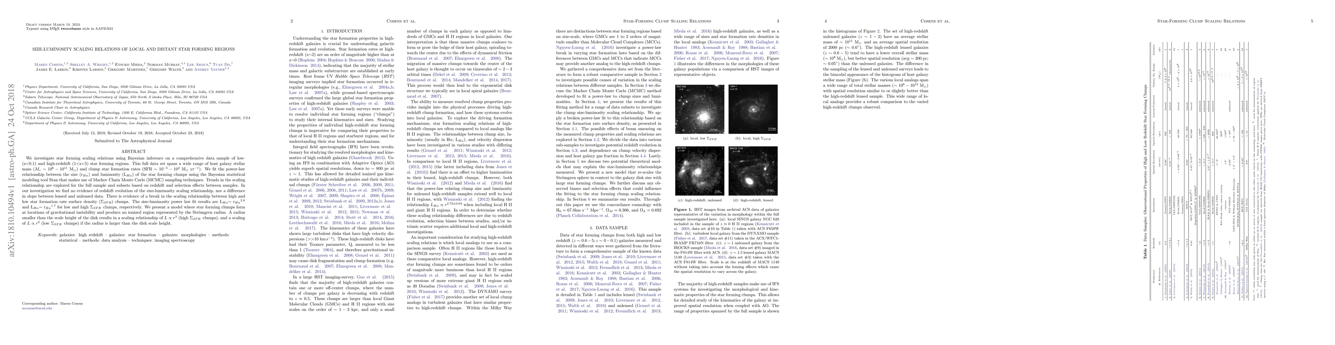 This study investigates the relationship between star-forming region size and luminosity across different redshifts and galaxy stellar masses, finding no evidence of redshift evolution but a break in the scaling relationship at varying surface density thresholds.