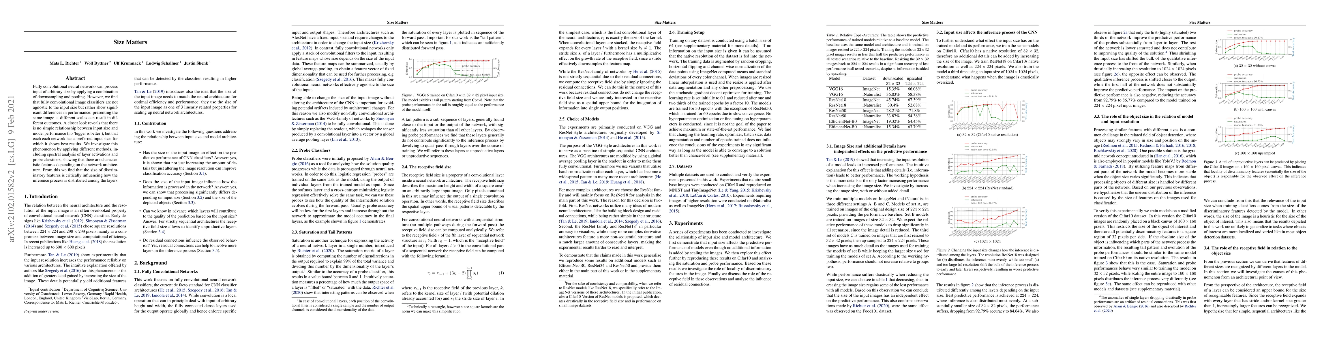 Fully convolutional neural networks can process input of arbitrary size by applying a combination of downsampling and pooling. However, we find that fully convolutional image classifiers are not agnostic to the input size but rather show significant differences in performance: presenting the same image at different scales can result in different outcomes. A closer look reveals that there is no simple relationship between input size and model performance (no `bigger is better'), but that each each network has a preferred input size, for which it shows best results. We investigate this phenomenon by applying different methods, including spectral analysis of layer activations and probe classifiers, showing that there are characteristic features depending on the network architecture. From this we find that the size of discriminatory features is critically influencing how the inference process is distributed among the layers.