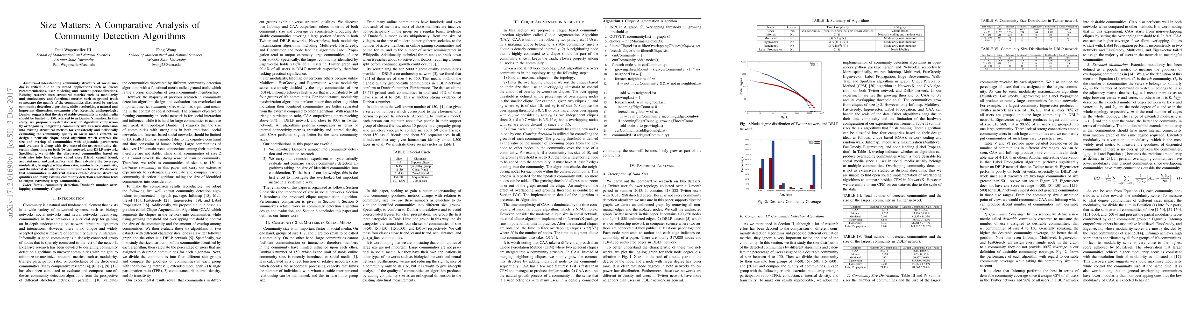 The research proposes a systematic comparison of community detection algorithms by integrating community size as a new dimension with existing structural metrics. A heuristic clique-based algorithm, CliqueAugmentationAlgorithm (CAA), is designed and evaluated alongside five other state-of-the-art algorithms on Twitter and DBLP networks.