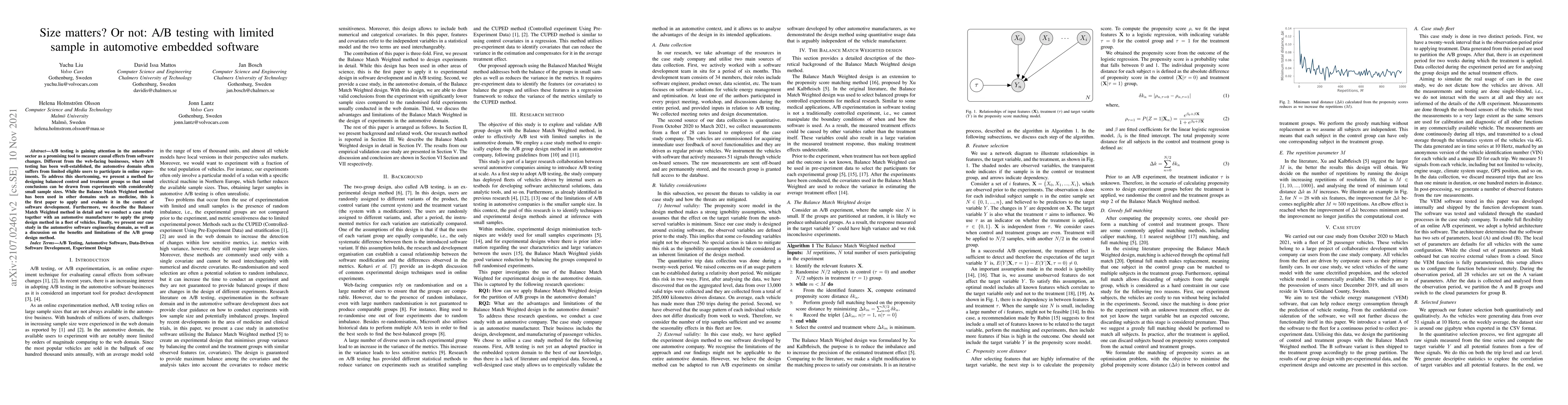 This research proposes a method to conduct effective A/B testing in automotive embedded software development using small sample sizes through the Balance Match Weighted technique, originally from medicine, and demonstrates its application in a case study with an automotive manufacturer, discussing its benefits and limitations.