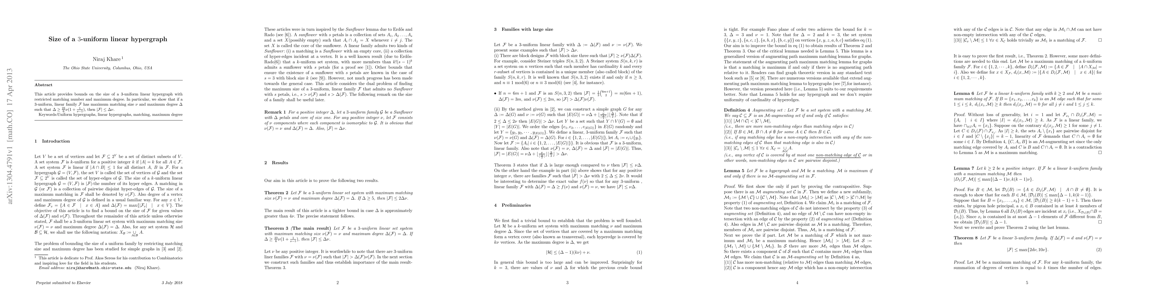 This article provides bounds on the size of a 3-uniform linear hypergraph with restricted matching number and maximum degree. In particular, we show that if a 3-uniform, linear family $\mathcal{F}$ has maximum matching size $\nu$ and maximum degree $\Delta$ such that $\Delta\geq \frac{23}{6}\nu(1+\frac{1}{\nu-1})$, then $|\mathcal{F}|\leq \Delta \nu$.