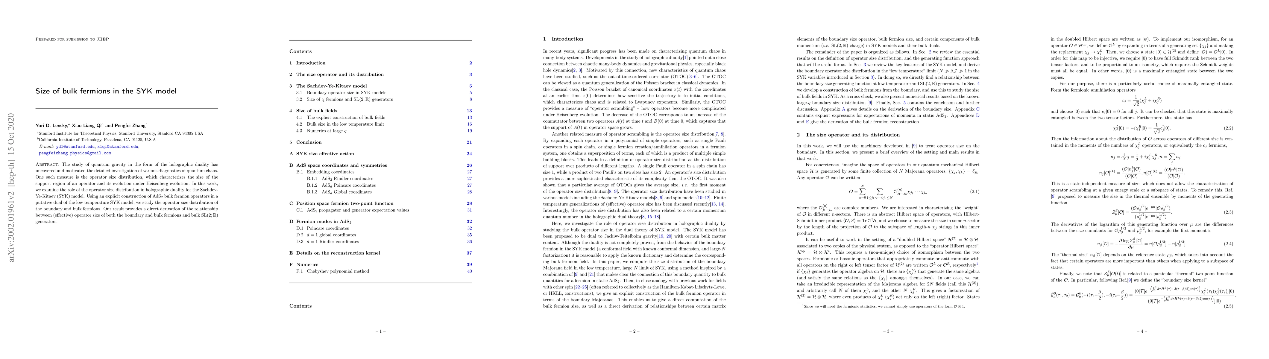 The study of quantum gravity in the form of the holographic duality has uncovered and motivated the detailed investigation of various diagnostics of quantum chaos. One such measure is the operator size distribution, which characterizes the size of the support region of an operator and its evolution under Heisenberg evolution. In this work, we examine the role of the operator size distribution in holographic duality for the Sachdev-Ye-Kitaev (SYK) model. Using an explicit construction of AdS$_2$ bulk fermion operators in a putative dual of the low temperature SYK model, we study the operator size distribution of the boundary and bulk fermions. Our result provides a direct derivation of the relationship between (effective) operator size of both the boundary and bulk fermions and bulk $\text{SL}(2; \mathbb{R})$ generators.
