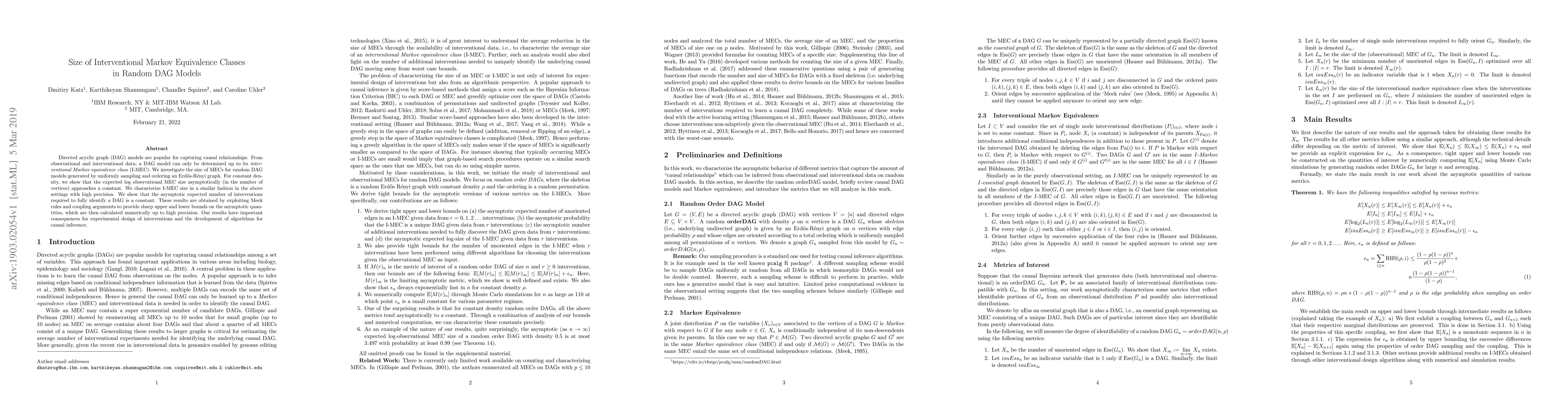 Directed acyclic graph (DAG) models are popular for capturing causal relationships. From observational and interventional data, a DAG model can only be determined up to its \emph{interventional Markov equivalence class} (I-MEC). We investigate the size of MECs for random DAG models generated by uniformly sampling and ordering an Erd\H{o}s-R\'{e}nyi graph. For constant density, we show that the expected $\log$ observational MEC size asymptotically (in the number of vertices) approaches a constant. We characterize I-MEC size in a similar fashion in the above settings with high precision. We show that the asymptotic expected number of interventions required to fully identify a DAG is a constant. These results are obtained by exploiting Meek rules and coupling arguments to provide sharp upper and lower bounds on the asymptotic quantities, which are then calculated numerically up to high precision. Our results have important consequences for experimental design of interventions and the development of algorithms for causal inference.