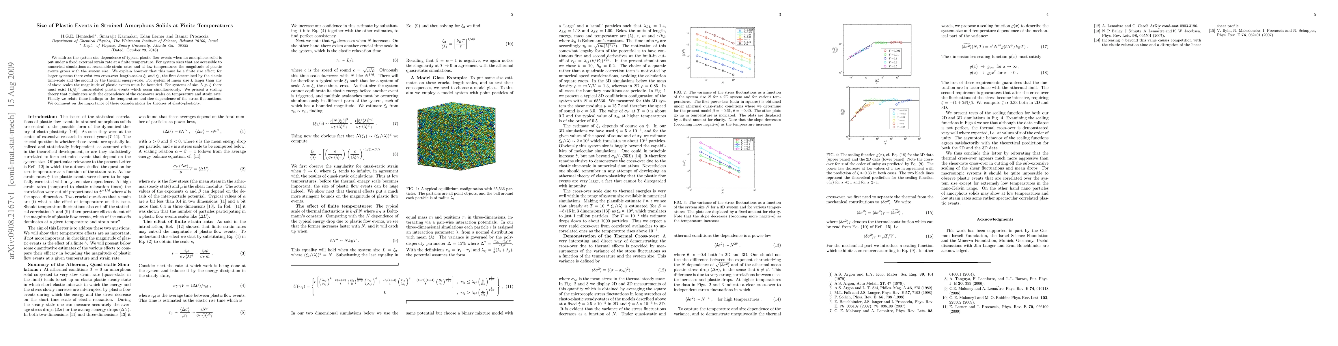 Researchers studied how plastic flow events change in size as they occur in larger amorphous solids under fixed strain rates at finite temperatures. They found that these events have two cross-over length-scales determined by the material's elastic and thermal properties.