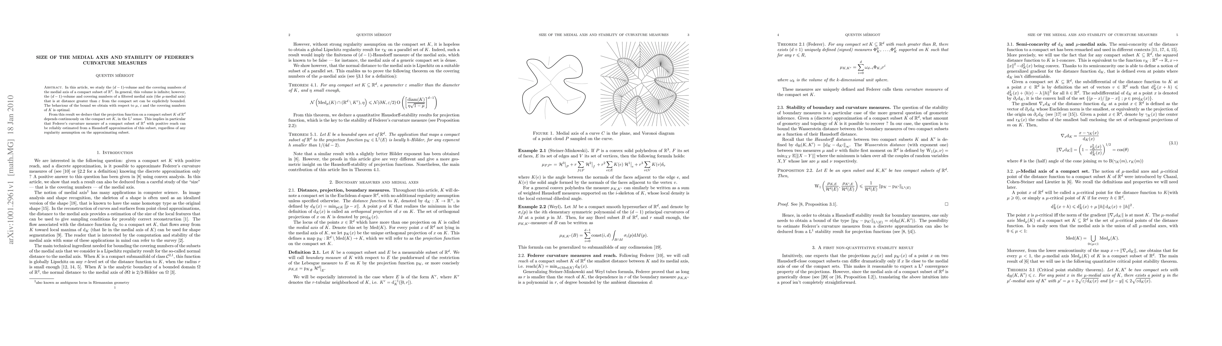 This paper investigates the finite bounds of the (d-1)-volume and covering numbers of the filtered medial axis of compact sets in Euclidean d-space, demonstrating optimal behavior with respect to parameters. It concludes that the projection function on compact subsets is stable, ensuring the reliable estimation of Federer's curvature measures from Hausdorff approximations without requiring regularity assumptions.