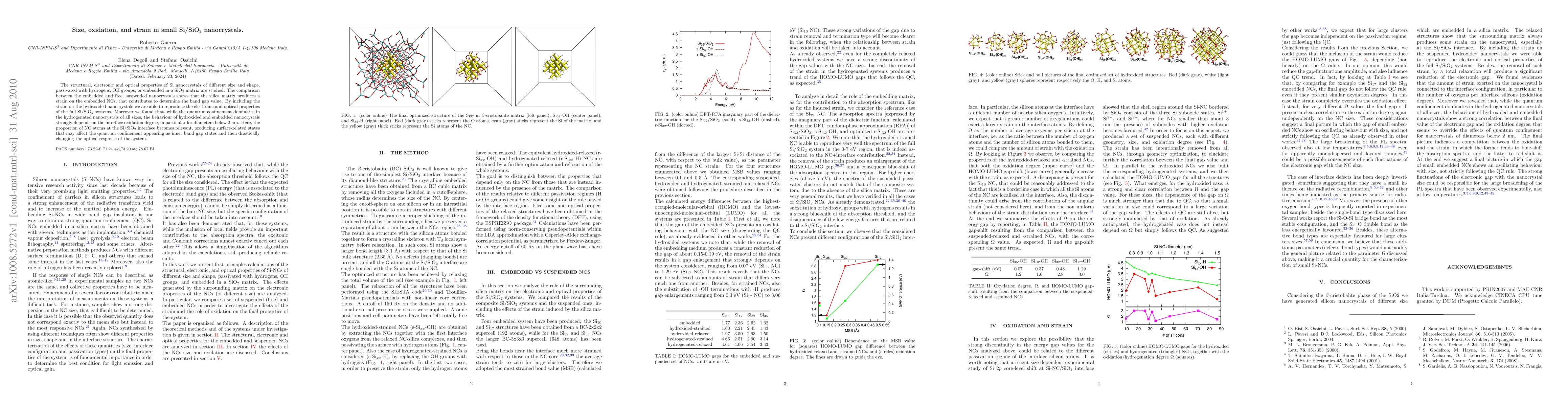 This paper investigates the influence of size, oxidation, and strain on the properties of Si nanocrystals embedded in a SiO2 matrix. The study reveals that the silica matrix induces strain affecting the band gap, and the oxidation degree at the Si/SiO2 interface significantly alters the quantum confinement effects, especially for nanocrystals below 2 nm in diameter.