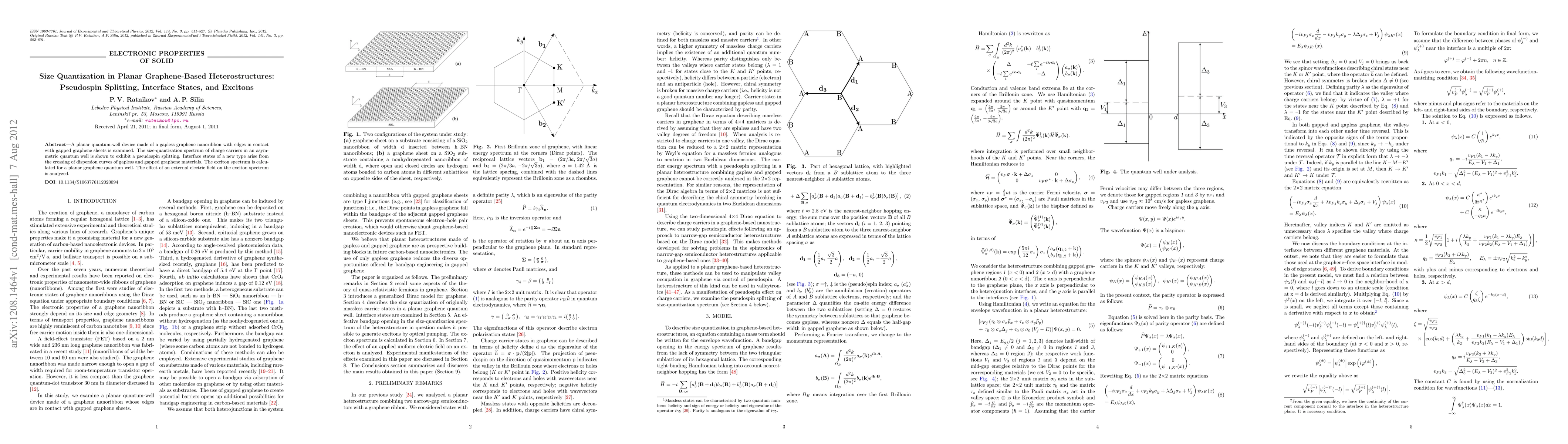 This paper investigates a planar graphene-based heterostructure, revealing pseudospin splitting in the size-quantization spectrum due to asymmetric quantum well effects. It also explores new interface states from the interaction between gapless and gapped graphene materials, and analyzes the exciton spectrum and its response to external electric fields.
