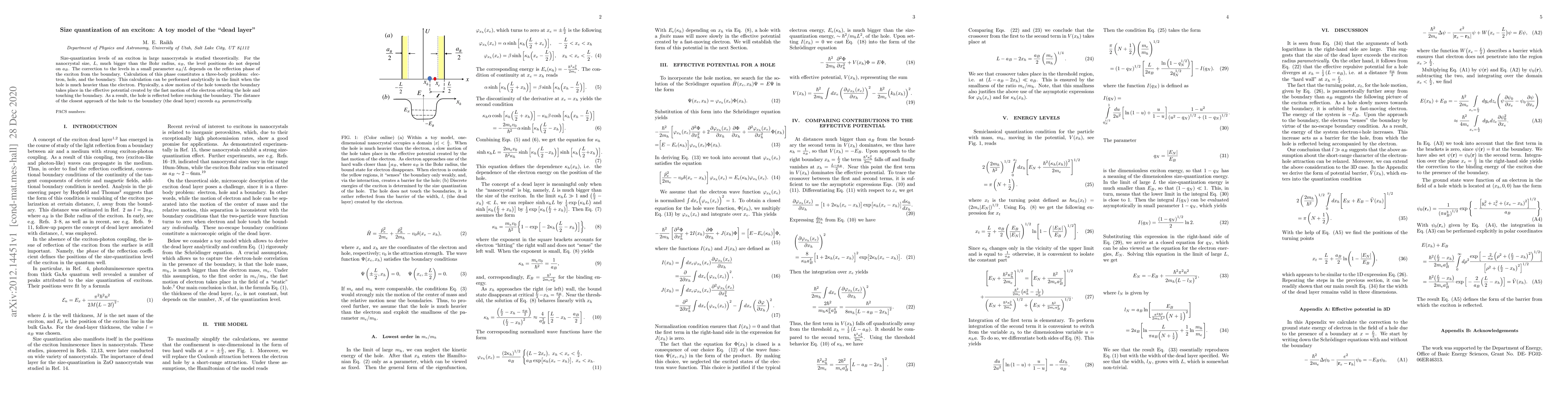 Size-quantization levels of an exciton in large nanocrystals is studied theoretically. For the nanocrystal size, $L$, much bigger than the Bohr radius, $a_B$, the level positions do not depend on $a_B$. The correction to the levels in a small parameter $a_B/L$ depends on the reflection phase of the exciton from the boundary. Calculation of this phase constitutes a three-body problem: electron, hole, and the boundary. This calculation can be performed analytically in the limit when the hole is much heavier than the electron. Physically, a slow motion of the hole towards the boundary takes place in the effective potential created by the fast motion of the electron orbiting the hole and touching the boundary. As a result, the hole is reflected before reaching the boundary. The distance of the closest approach of the hole to the boundary (the dead layer) exceeds $a_B$ parametrically.