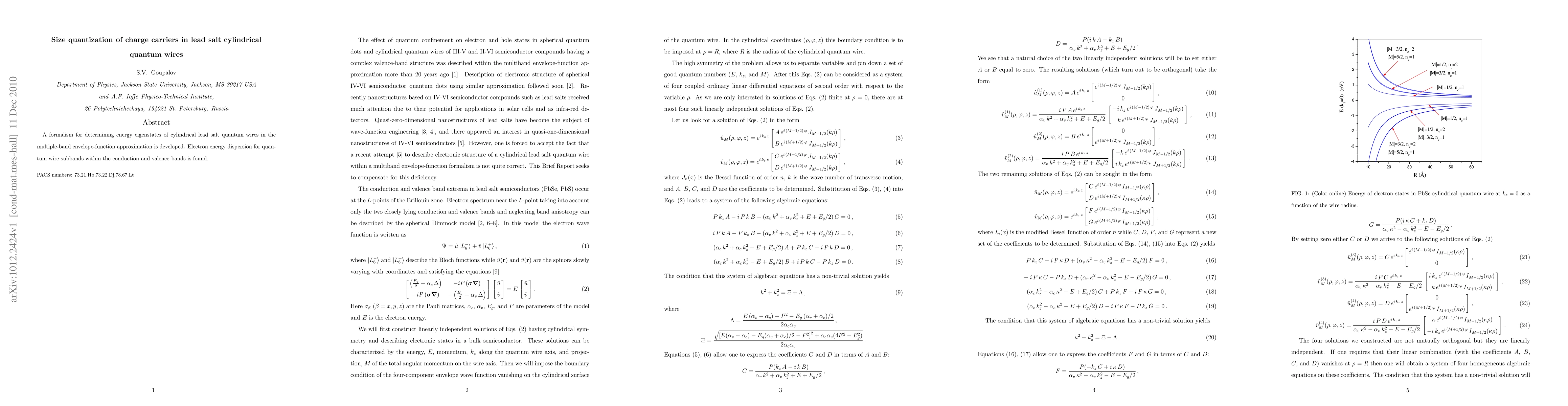 This research presents a method to determine energy levels of cylindrical lead salt quantum wires, revealing electron energy dispersion for subbands within conduction and valence bands, contributing to understanding charge carrier behavior in nanoscale structures.